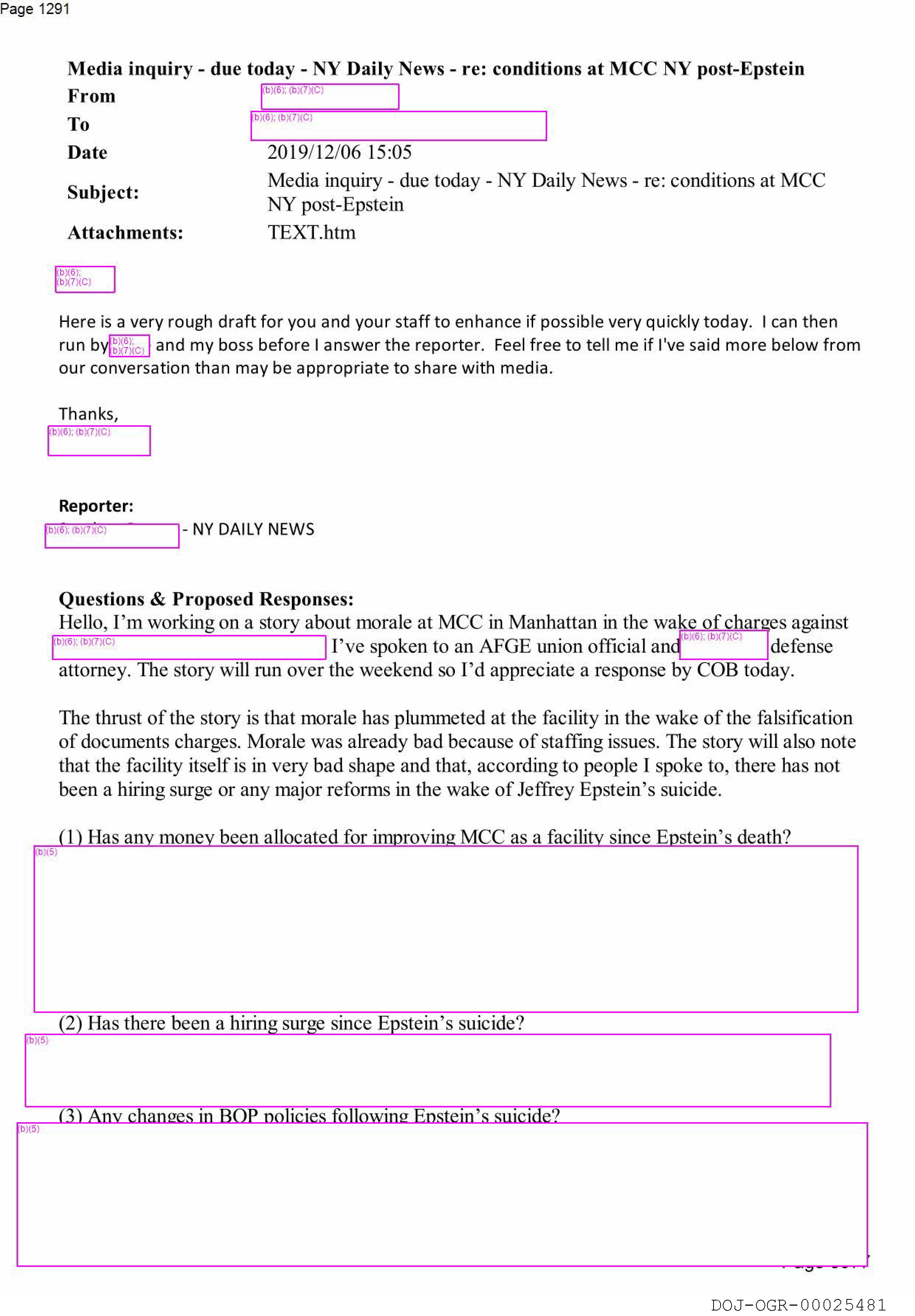 The image shows a printed document with handwritten annotations on it. The top of the page contains a redacted email address and a date stamp reading "15/02/2013." Below this is a heading that reads "Media Inquiry due to an article in Mr David Novak's book." The body of the document discusses the topic of the inquiry, which appears to be related to a specific project or event involving "MCDONALD'S." There are handwritten notes at the bottom right corner, with some words crossed out and rewritten, but the content is not entirely clear due to the quality of the image. The text is too small and blurry to read in detail.