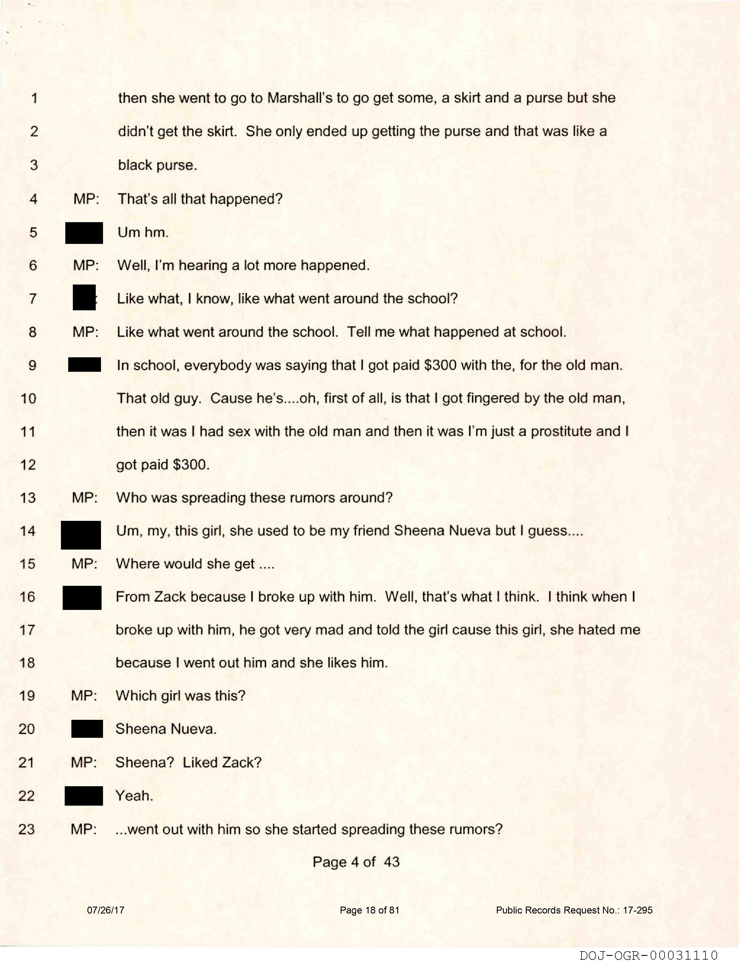 The image appears to be a printed document with redacted text, which means that parts of the content are intentionally obscured for privacy or security reasons. The redaction is achieved by covering the original words with either black lines or blocks, making them illegible. The document contains numbered lines, suggesting it's structured like an interview transcript, report, or list of questions and answers. There are visible numbers on the left side (10, 18, etc.) that seem to correspond to items on the list. The context of the redaction suggests that this is not a casual document but one where sensitive information has been removed.