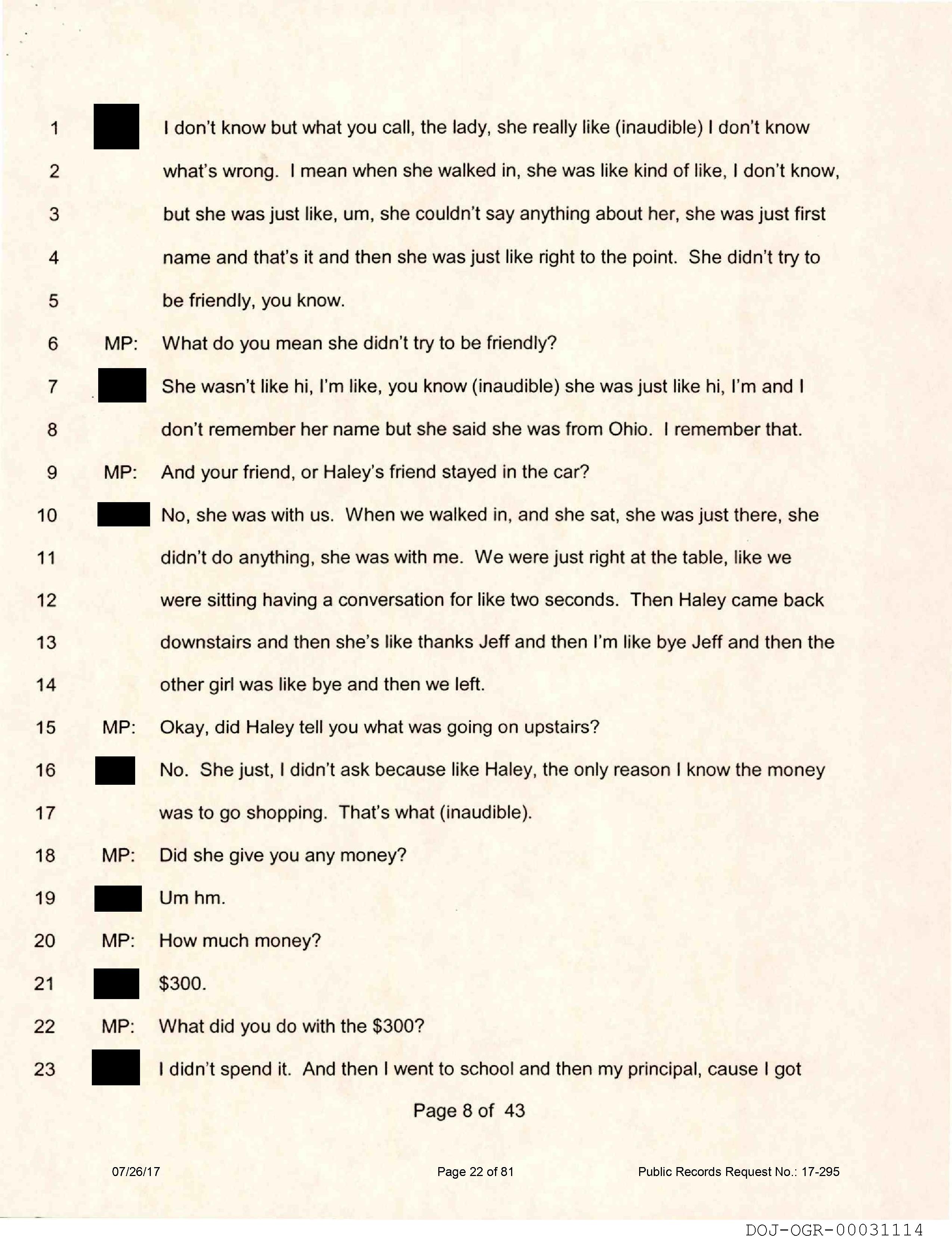 The image is a scanned document with text that appears to be an interview transcript. The text is partially obscured and seems to be missing some words due to the quality of the scan. From what can be read, it includes phrases such as "I don't know but you can ask her yourself" and "she didn't hit me. I was just playing with her," indicating that the conversation may have been about a girl or woman who is not present during the interview. The text is organized in a column format, typical for typed transcripts, and includes handwritten markings, suggesting it has been reviewed or edited by someone.