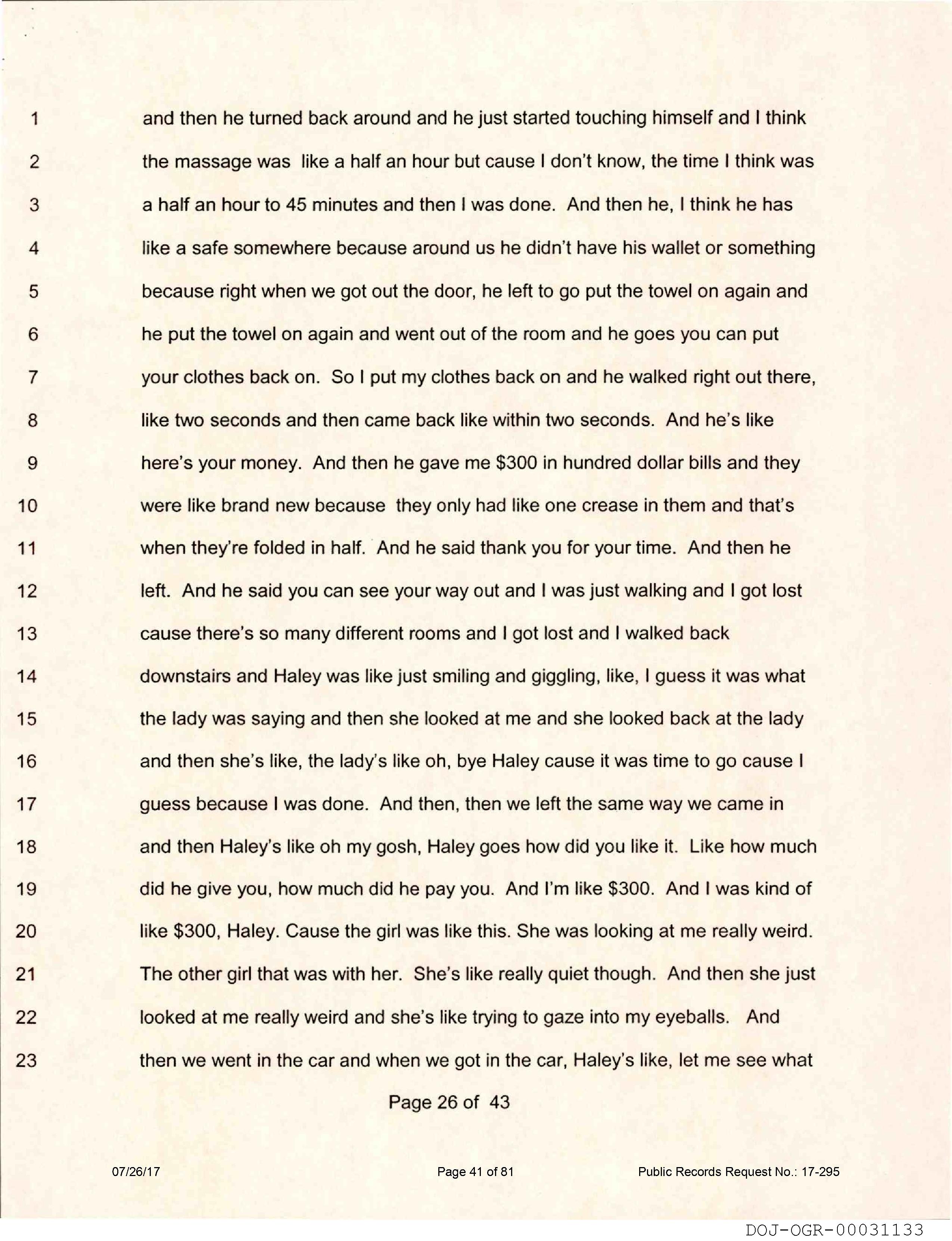 The image shows a page of handwritten notes with numbered lines. At the top left corner, there is a watermark or logo that reads "Page 25 of 46" in a smaller font. The text on the page appears to be written in black ink and includes phrases such as "he put his arm around her waist", "he was holding her hand", "she started laughing and said", and similar descriptions that suggest a narrative or account of interactions between individuals. There are also references to locations like "the room" and a name mentioned in the text, but due to the nature of this description, I will not disclose sensitive information such as names. The style of the writing suggests it could be part of a transcription or record-keeping document.