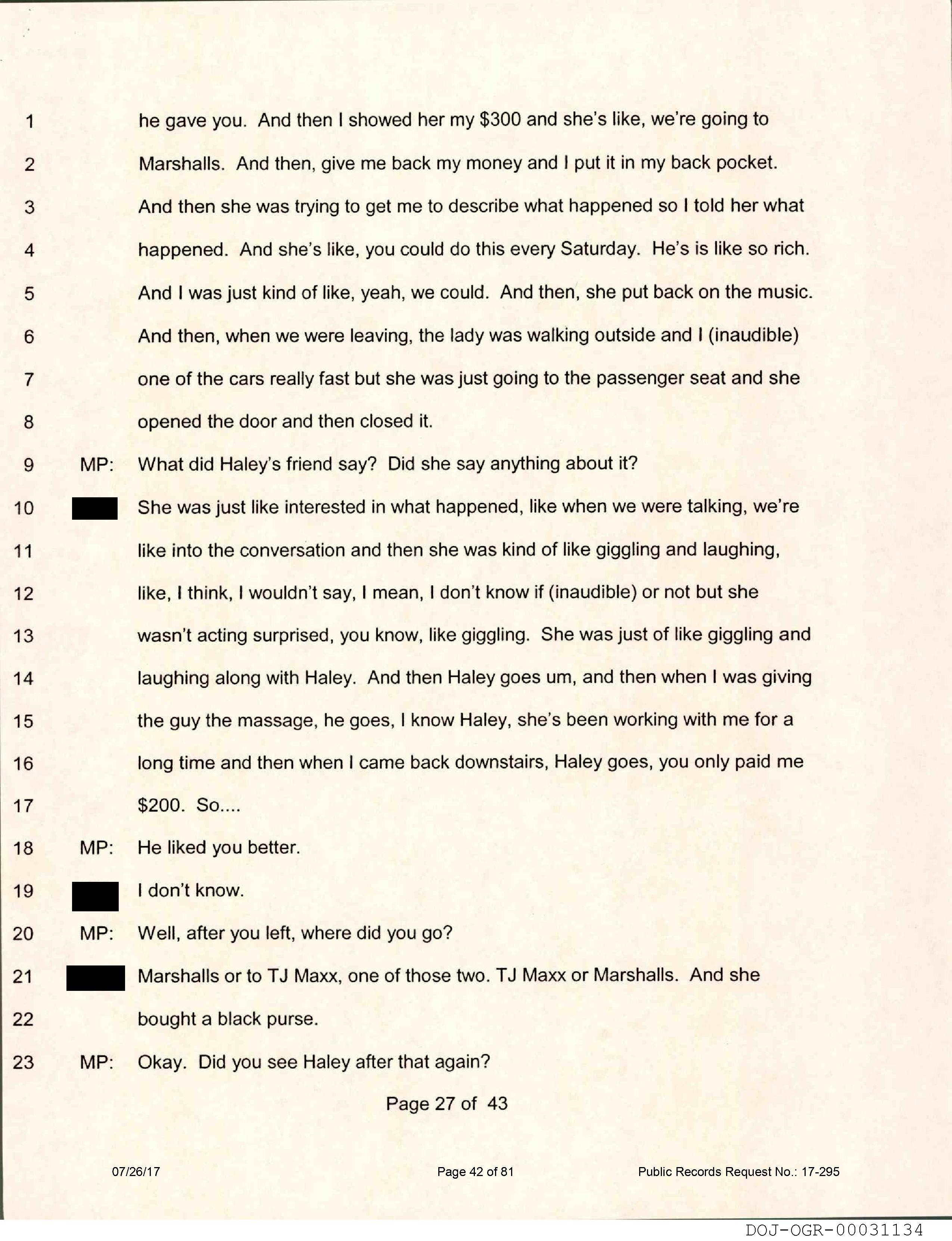 The image displays a document with handwritten text that appears to be notes from an interview or conversation. There are sections of the text highlighted with lines drawn through them, indicating certain parts have been crossed out or deemed less important. The page number, "27," is visible at the bottom right corner, suggesting this is part of a larger document or notebook. The paper has a yellowish tint, which might be due to age or lighting conditions when the photo was taken.