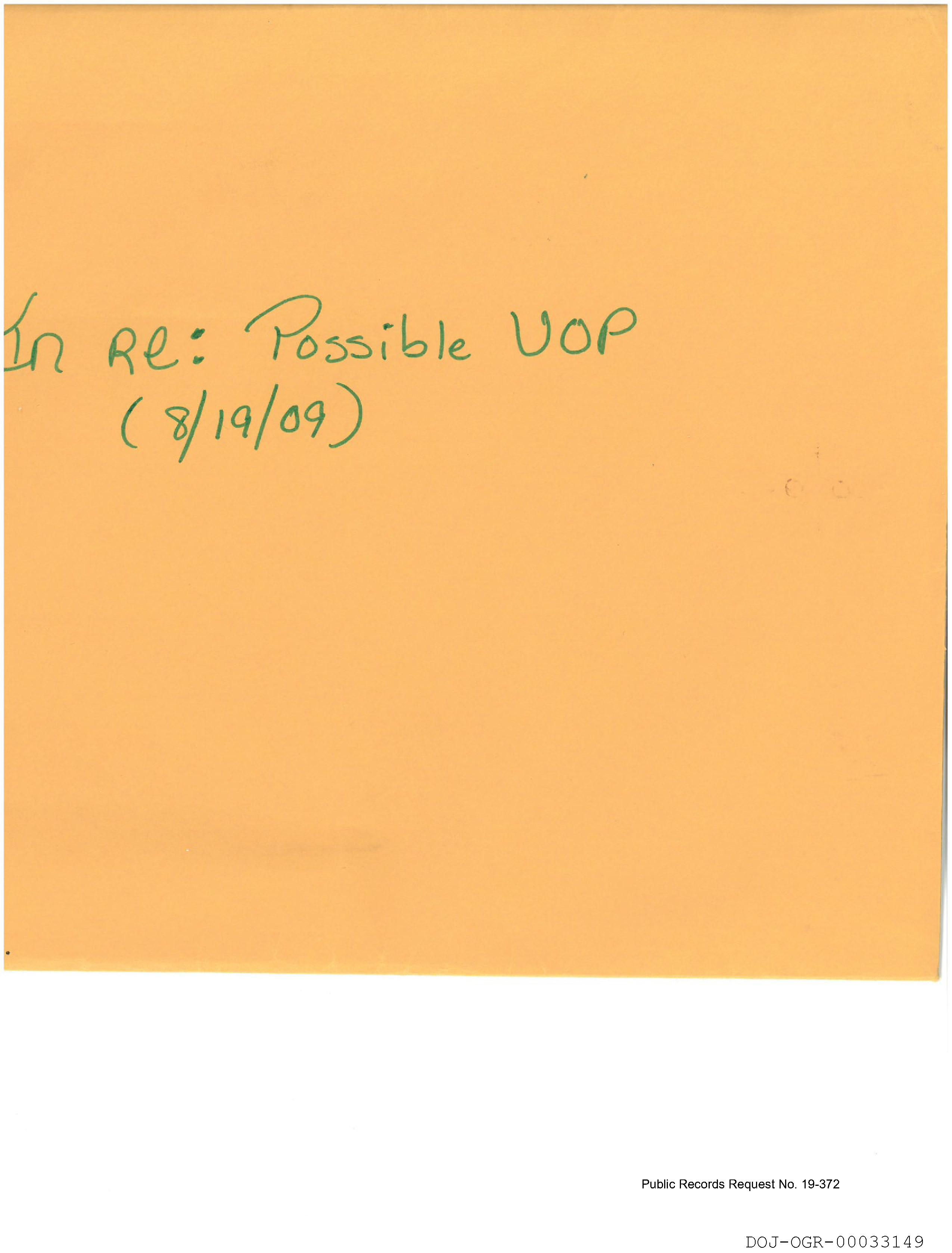 The image shows a sticky note with handwritten text on it. The note is yellow and placed against a neutral background. The person who wrote the note has used black ink to convey their message. They have mentioned "In RE: Possible UOP", which could be an abbreviation for something within a specific context, such as business or academic jargon. The handwriting suggests that it was written in a hurry or with some urgency. The rest of the background is not detailed and doesn't provide any additional information about the setting.