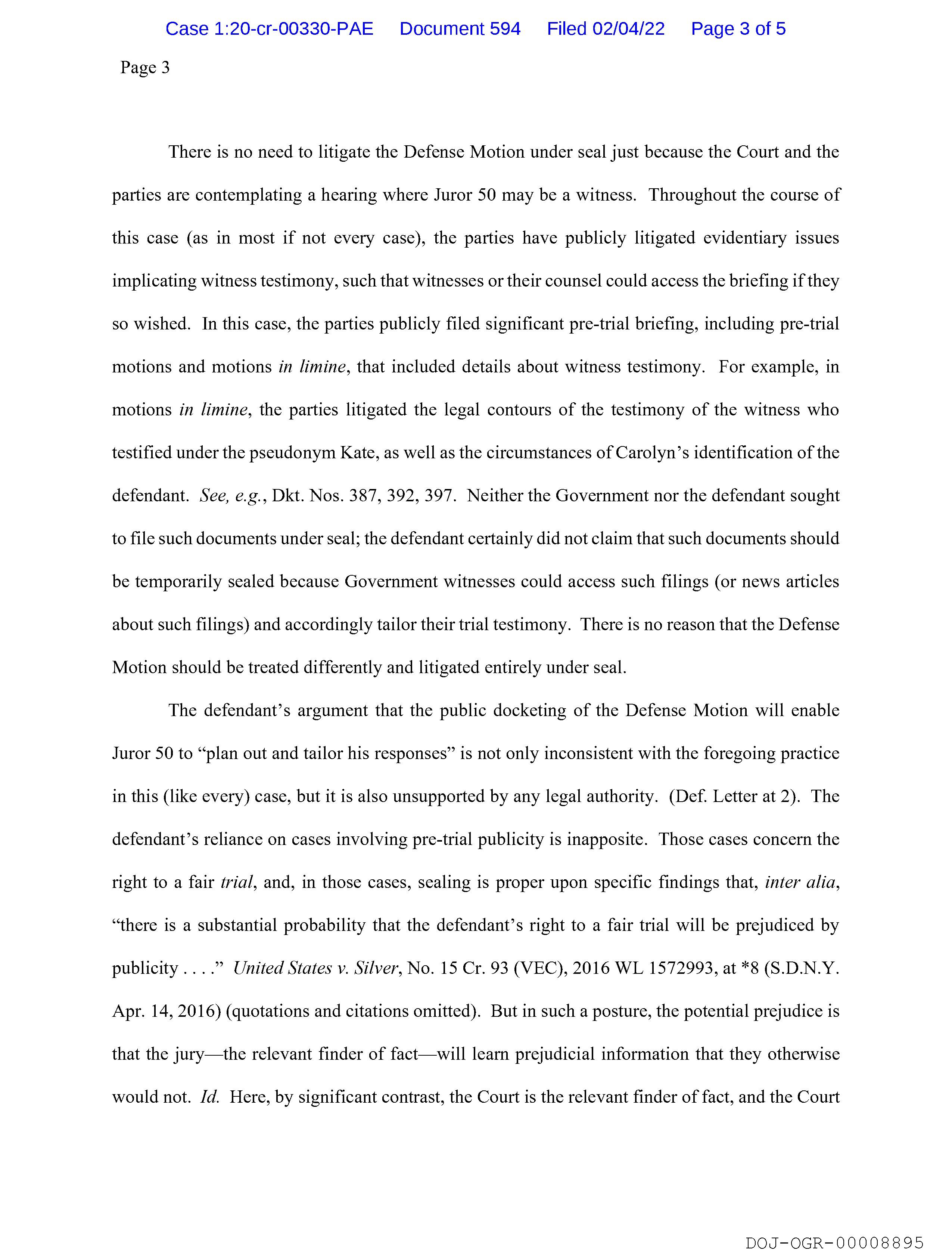 The image displays a scanned document with visible text and some blacked-out sections. The text appears to be from an official letter or report, possibly related to a legal case given the references to "Judge" and "Courtroom." There are also mentions of names that have been redacted. However, without more context, it's not possible to determine the exact nature of the document. The text is printed in black ink on a white background, indicating a standard typewritten format.