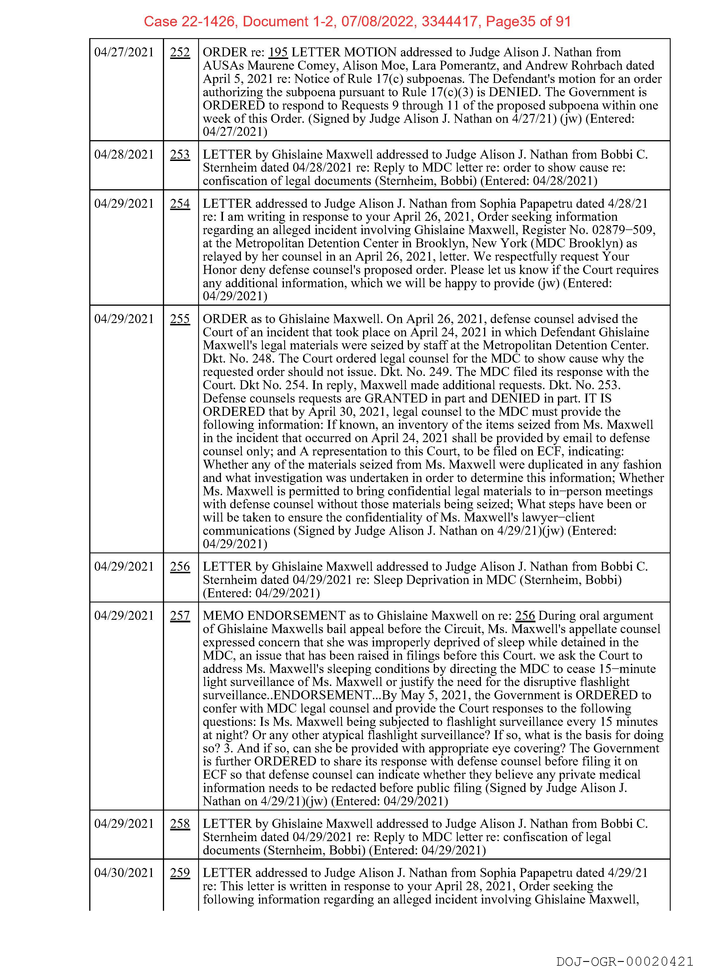 The image displays a scanned document with visible text and some blacked-out sections. The text appears to be from an official letter or report, possibly related to a legal case given the references to "Judge" and "Courtroom." There are also mentions of names that have been redacted. However, without more context, it's not possible to determine the exact nature of the document. The text is printed in black ink on a white background, indicating a standard typewritten format.