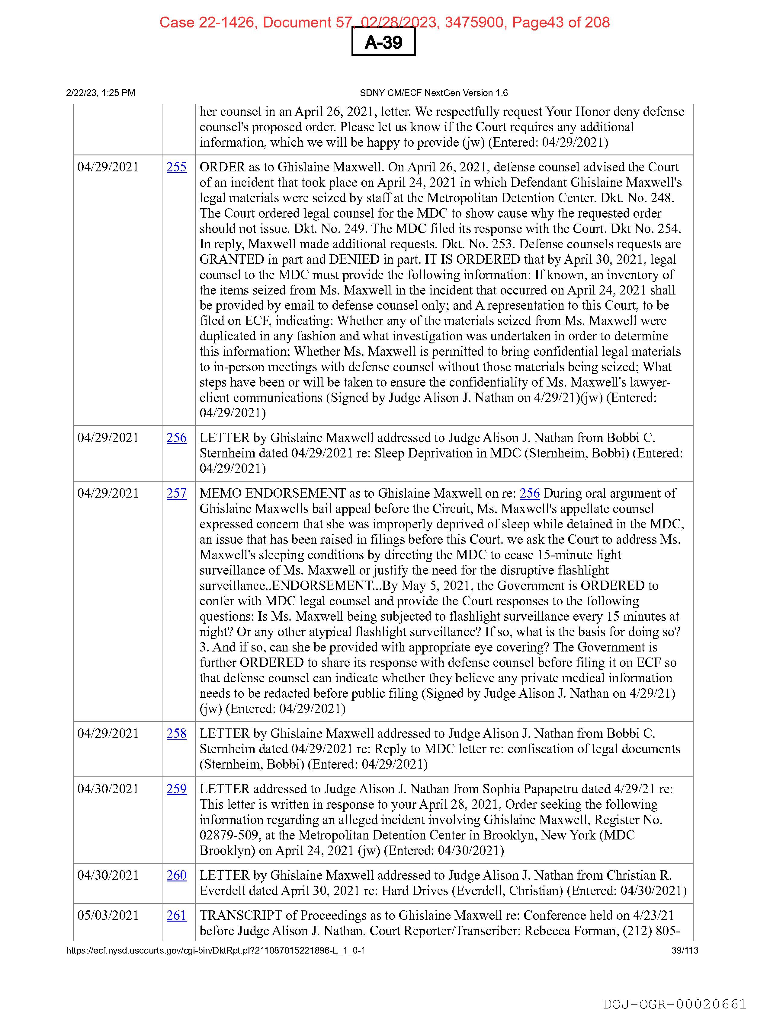 The image displays a scanned document with visible text and some blacked-out sections. The text appears to be from an official letter or report, possibly related to a legal case given the references to "Judge" and "Courtroom." There are also mentions of names that have been redacted. However, without more context, it's not possible to determine the exact nature of the document. The text is printed in black ink on a white background, indicating a standard typewritten format.
