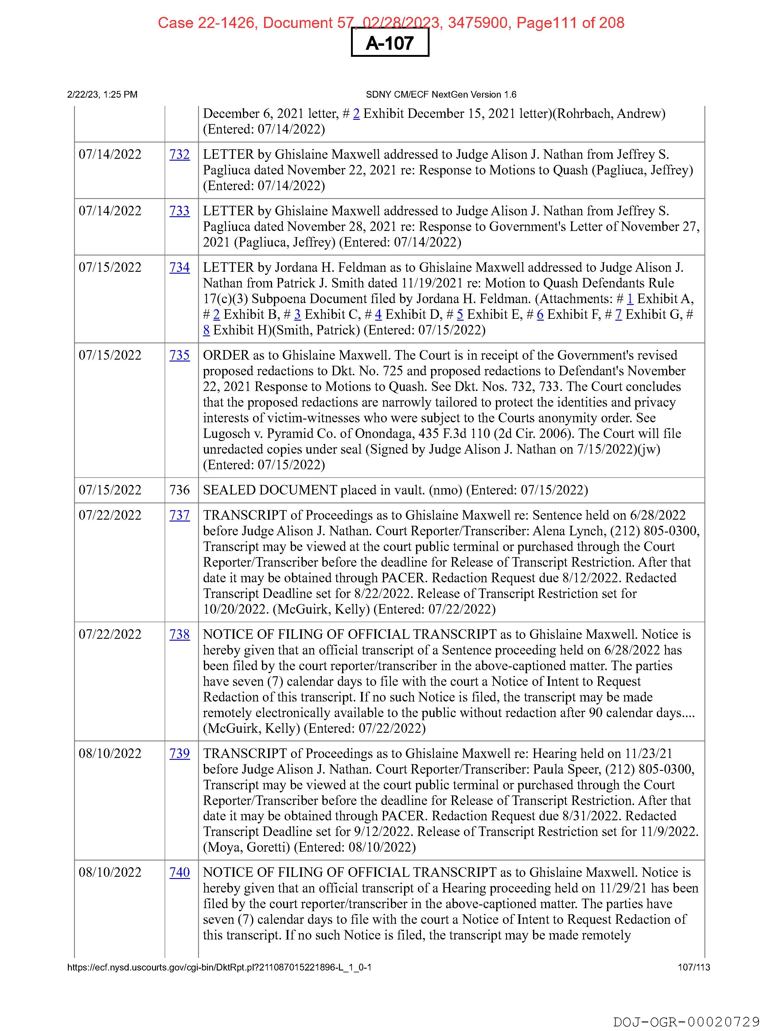 The image displays a scanned document with visible text and some blacked-out sections. The text appears to be from an official letter or report, possibly related to a legal case given the references to "Judge" and "Courtroom." There are also mentions of names that have been redacted. However, without more context, it's not possible to determine the exact nature of the document. The text is printed in black ink on a white background, indicating a standard typewritten format.
