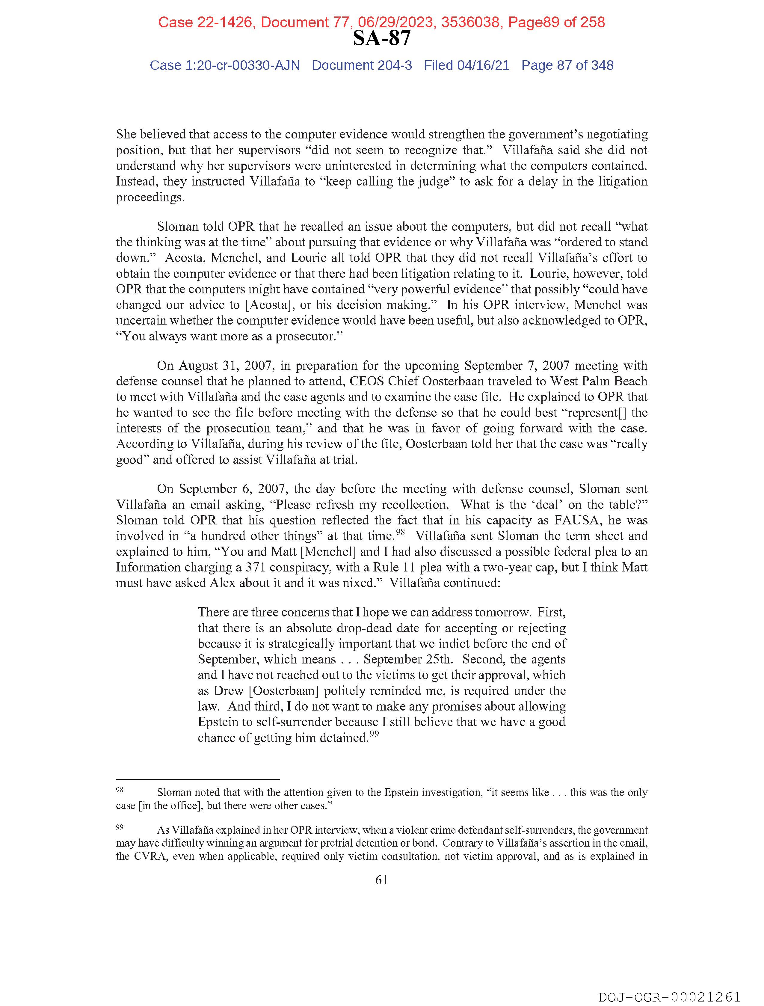 The image displays a scanned document with visible text and some blacked-out sections. The text appears to be from an official letter or report, possibly related to a legal case given the references to "Judge" and "Courtroom." There are also mentions of names that have been redacted. However, without more context, it's not possible to determine the exact nature of the document. The text is printed in black ink on a white background, indicating a standard typewritten format.