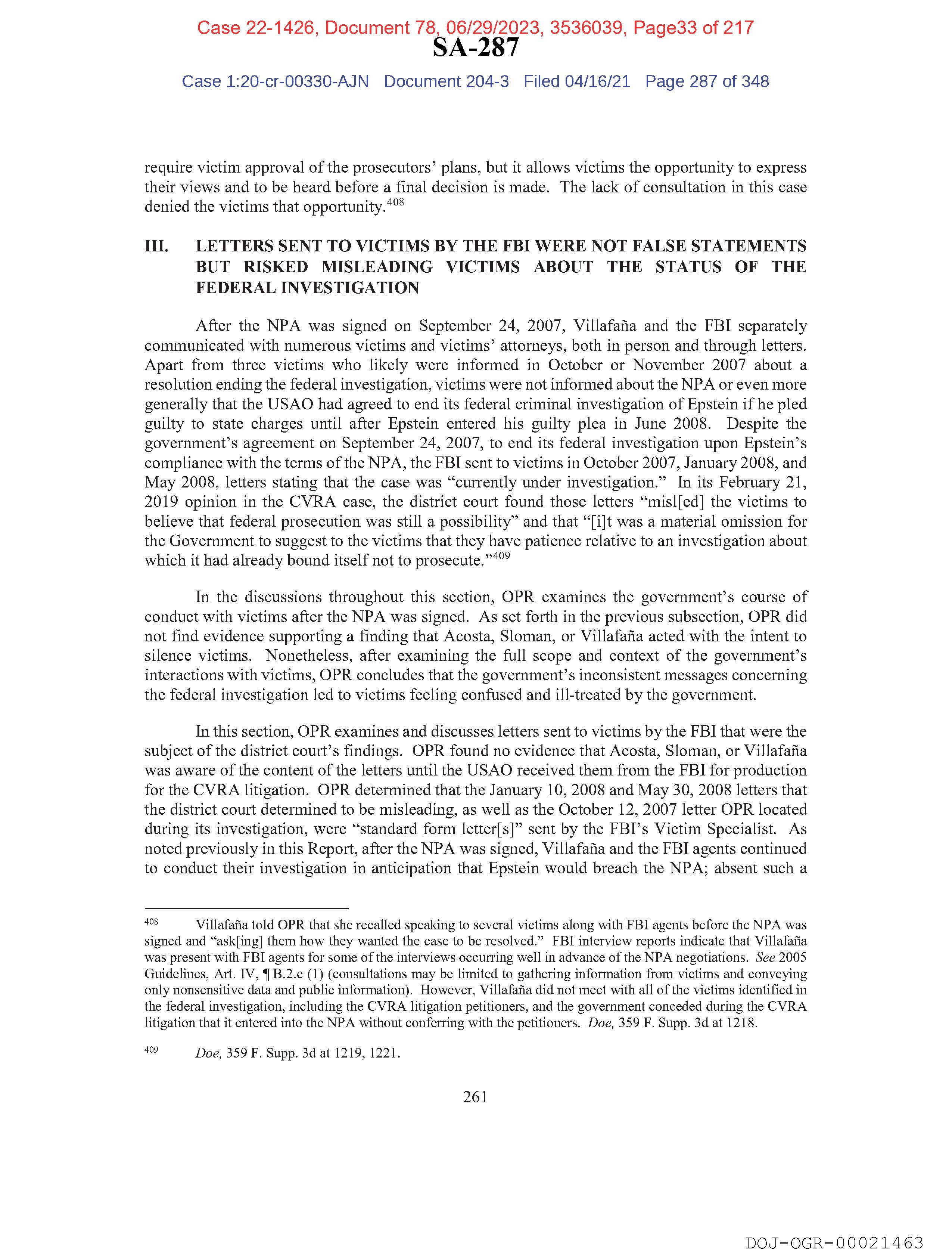 The image appears to be a photograph of a printed document from the Federal Bureau of Investigation (FBI). The top part of the document shows the FBI's official seal and logo. The document is partially redacted with black lines covering certain information, including names or other sensitive details that would typically identify individuals involved in an investigation. The visible text includes dates and references to legal proceedings such as "Case Number" and a court citation. There are also instructions for handling the document, indicating it is a restricted piece of evidence related to an ongoing case.