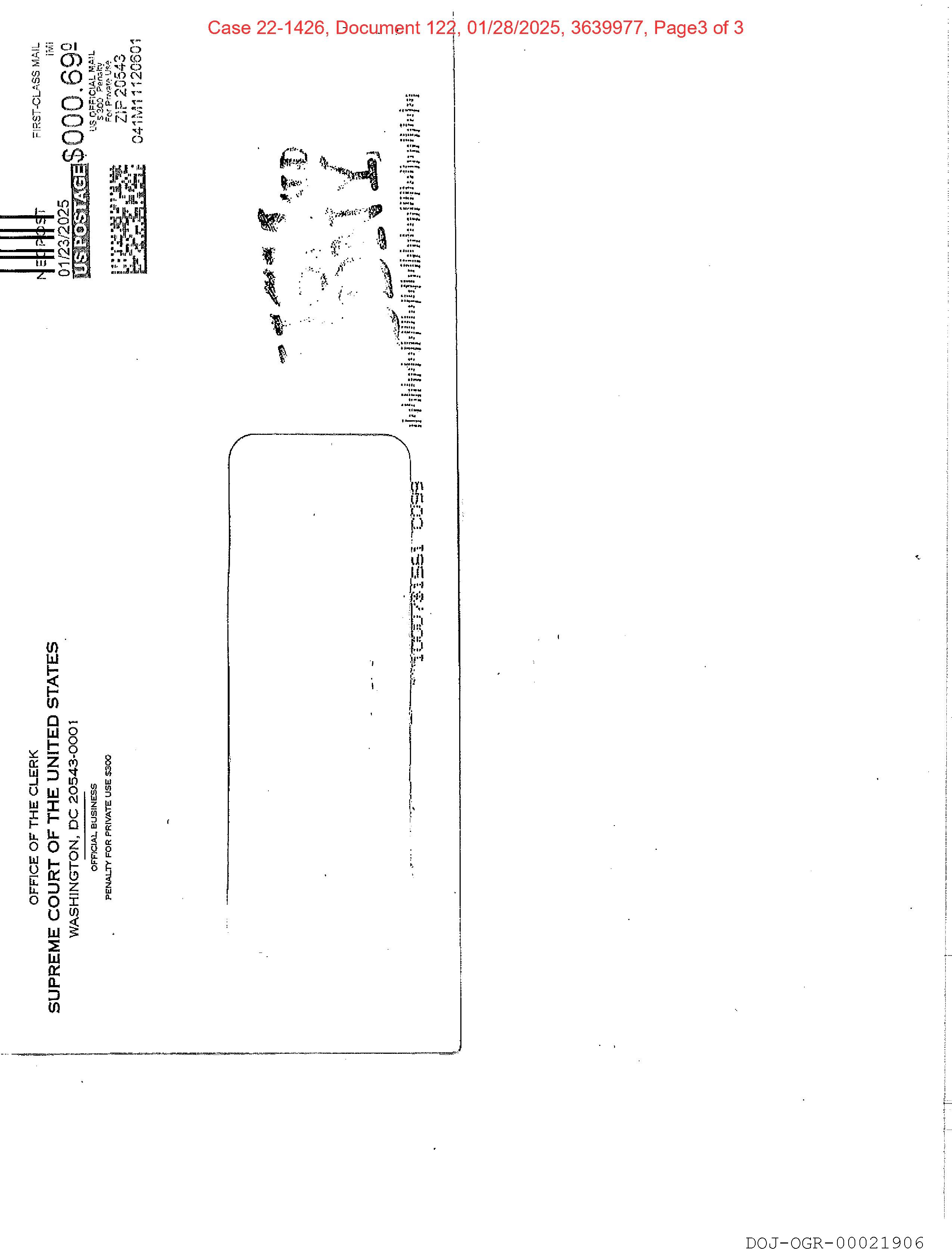 The image is a photograph of a piece of mail. The envelope appears to be sealed with a flap on top and the back side is facing up, so most of the visible text is upside down. There's no clear legibility of any personal information, but there are some visible features such as the barcode which might contain tracking data for the postal service. The envelope also has printed texts that could indicate the sender or recipient information; however, due to the angle and quality of the image, they are not readable.
