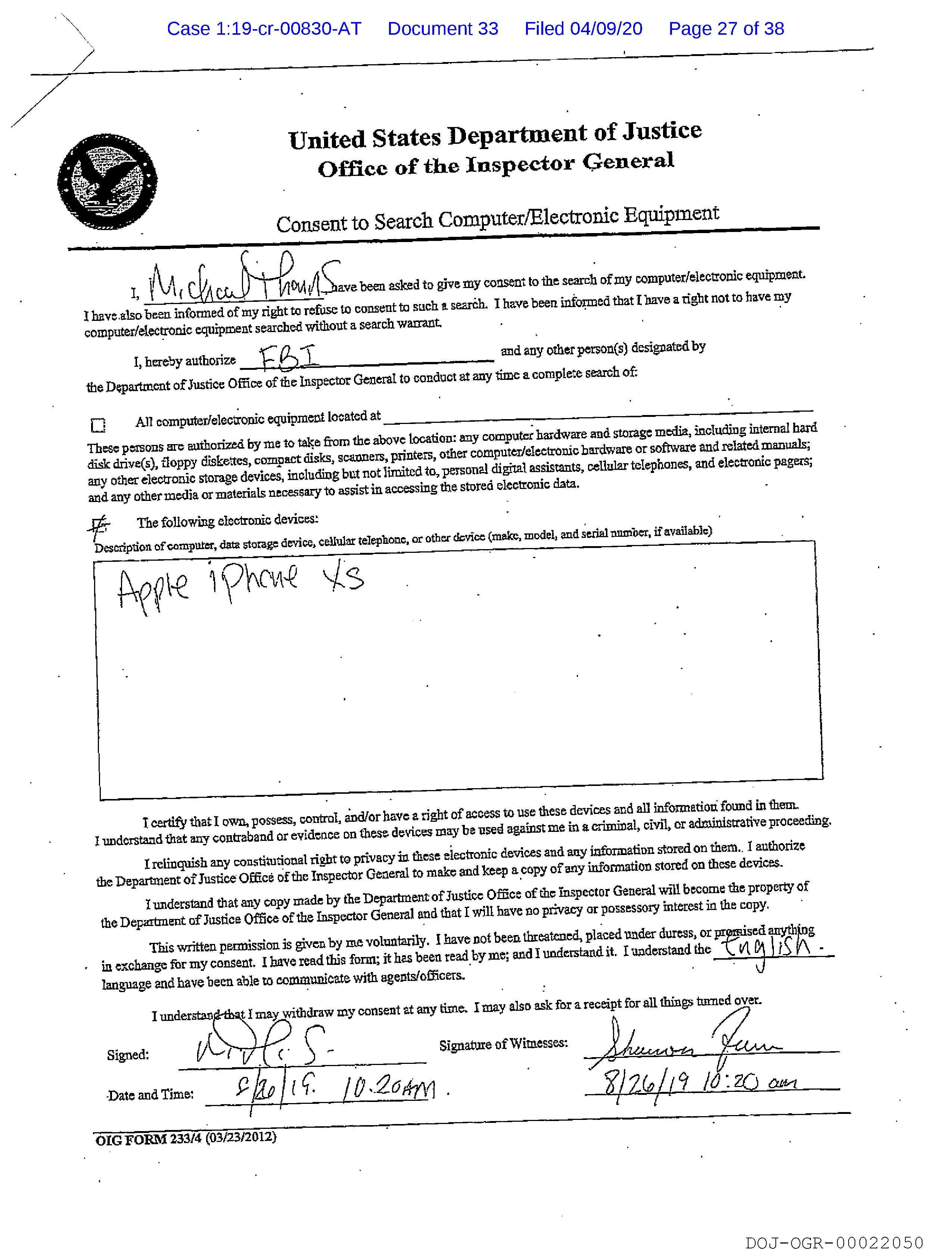 The image displays a scanned document with visible text and some blacked-out sections. The text appears to be from an official letter or report, possibly related to a legal case given the references to "Judge" and "Courtroom." There are also mentions of names that have been redacted. However, without more context, it's not possible to determine the exact nature of the document. The text is printed in black ink on a white background, indicating a standard typewritten format.