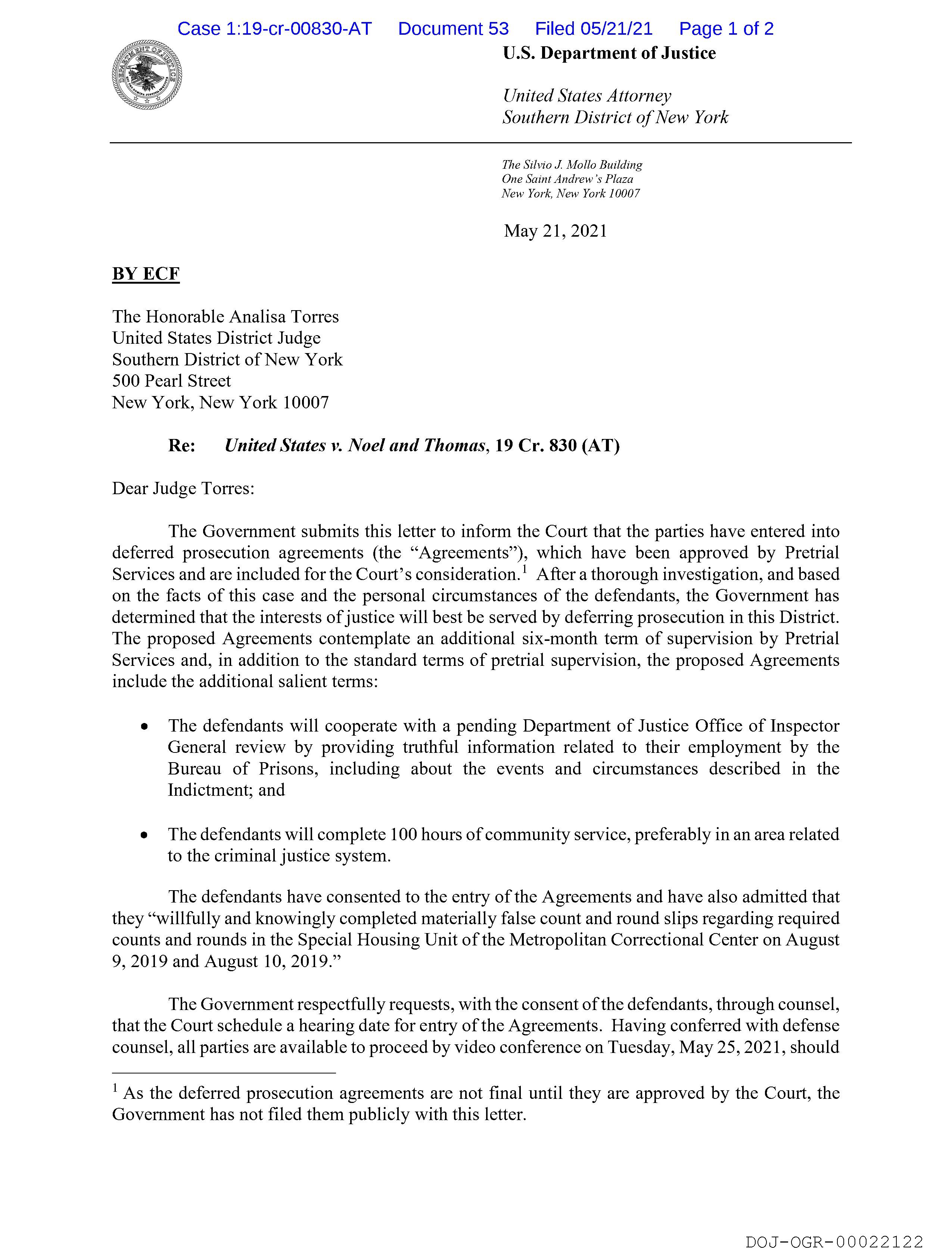 The image displays a scanned document with visible text and some blacked-out sections. The text appears to be from an official letter or report, possibly related to a legal case given the references to "Judge" and "Courtroom." There are also mentions of names that have been redacted. However, without more context, it's not possible to determine the exact nature of the document. The text is printed in black ink on a white background, indicating a standard typewritten format.