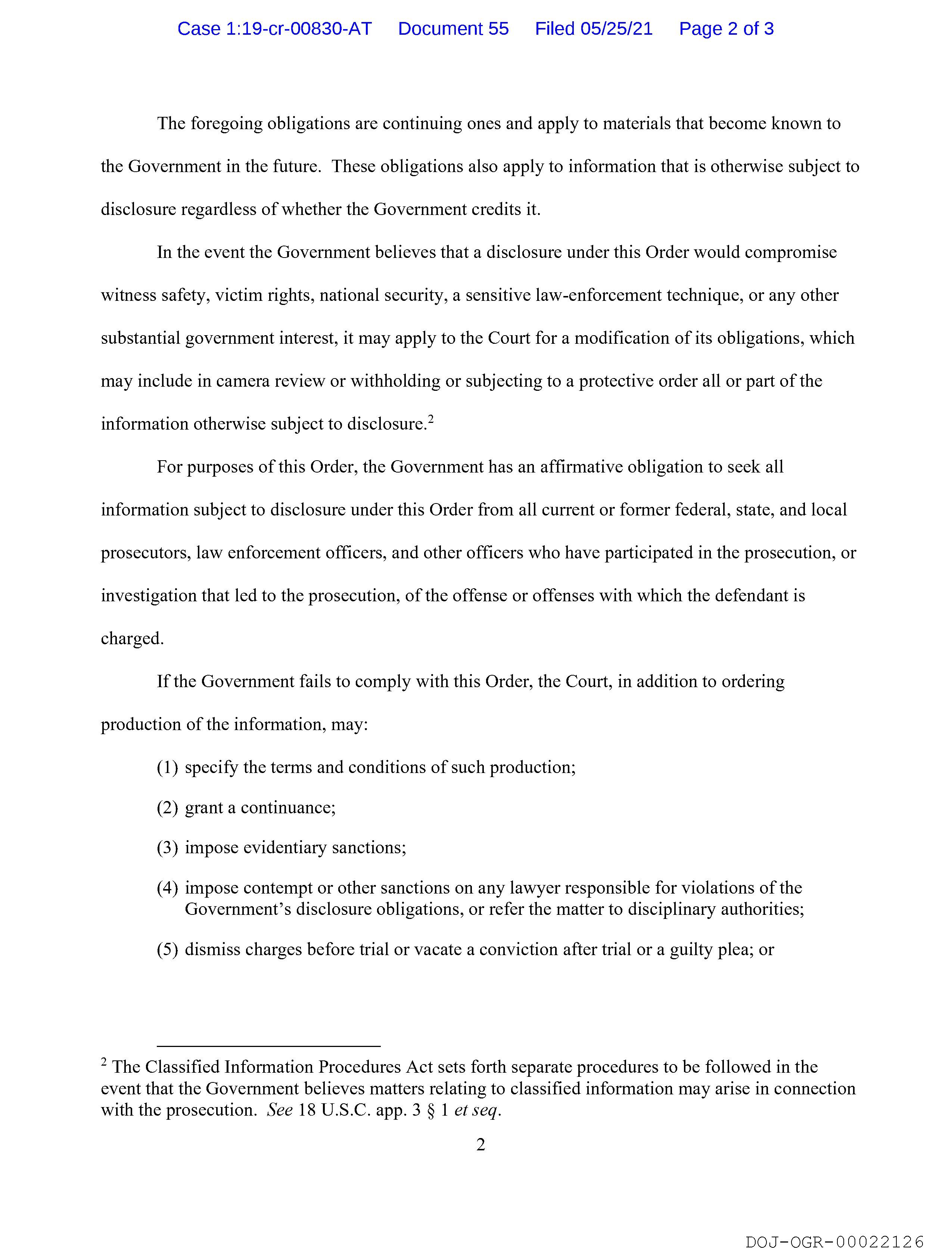 The image appears to be a photograph of a printed document from the Federal Bureau of Investigation (FBI). The top part of the document shows the FBI's official seal and logo. The document is partially redacted with black lines covering certain information, including names or other sensitive details that would typically identify individuals involved in an investigation. The visible text includes dates and references to legal proceedings such as "Case Number" and a court citation. There are also instructions for handling the document, indicating it is a restricted piece of evidence related to an ongoing case.