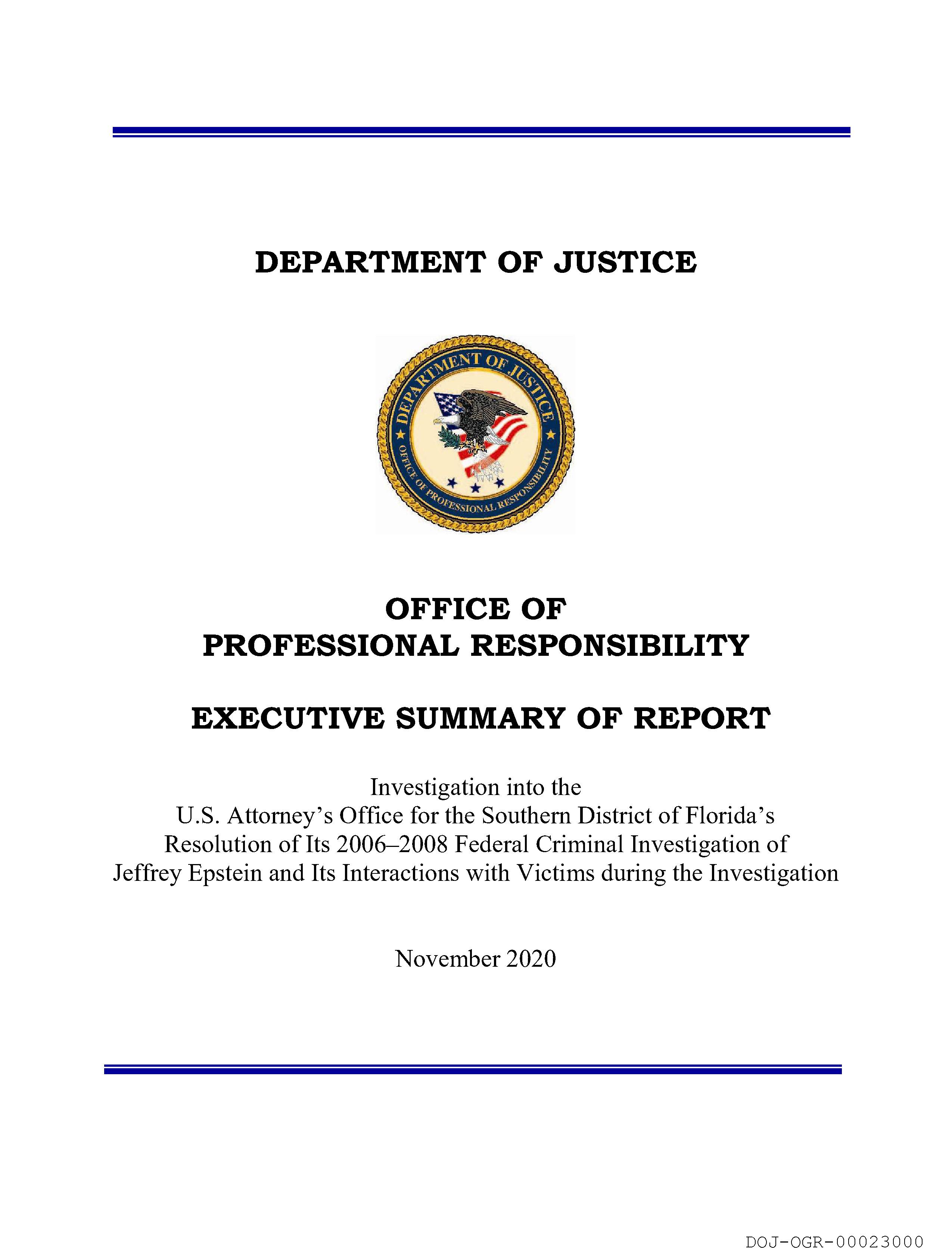 The image displays the cover page of a report from the Department of Justice. At the top of the page, there is a logo consisting of an eagle and the American flag. The title "OFFICE OF PROFESSIONAL RESPONSIBILITY" is prominently displayed in bold lettering. Below this, the document's subject matter is identified as an "EXECUTIVE SUMMARY OF REPORT". Further text indicates that it pertains to the Los Angeles County Sheriff’s Department for the year 2016-2017. The document is dated November 2018. There are no visible people or locations within this image; the focus is on the textual information and the logos related to the United States government agencies involved.