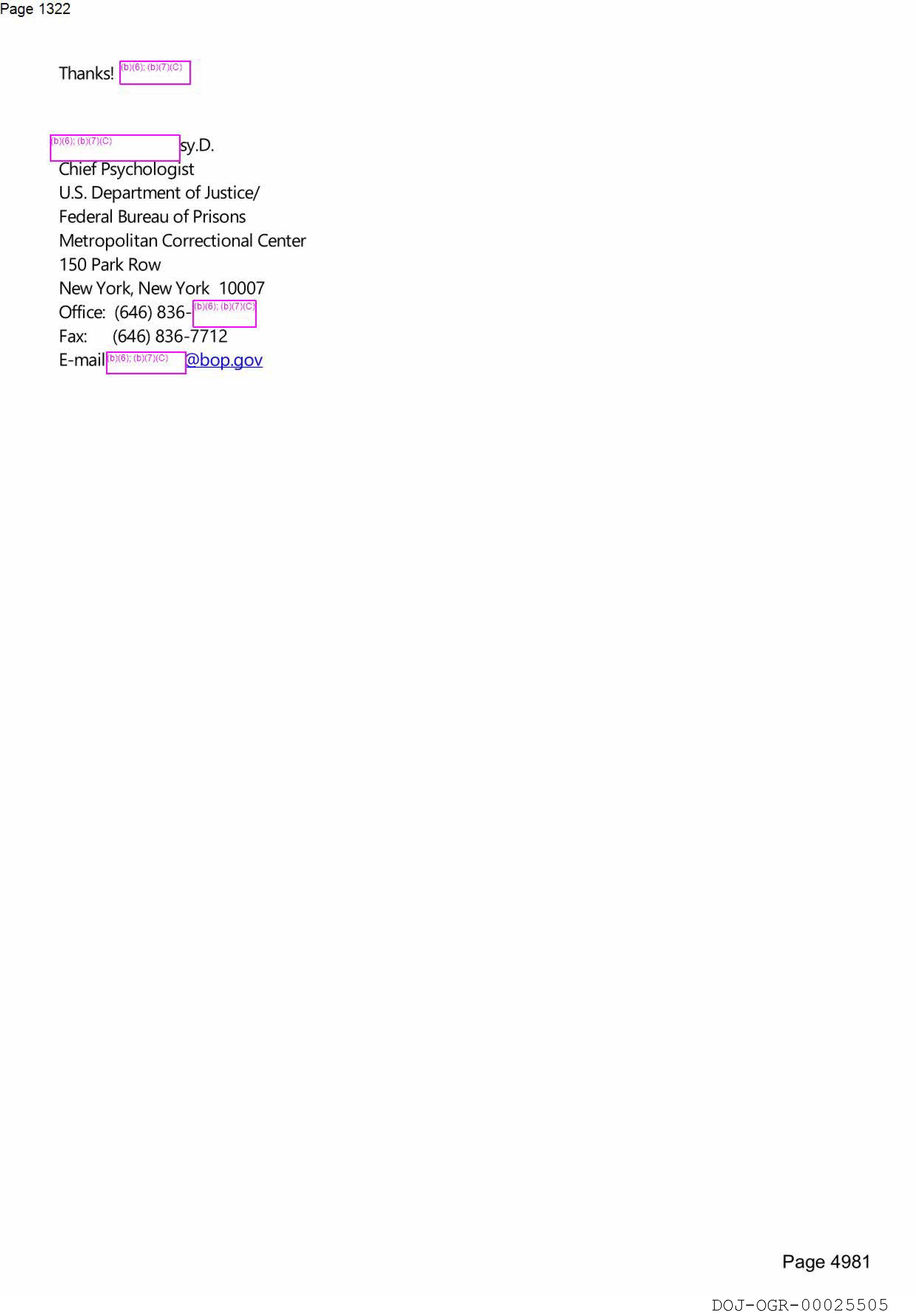 The image displays a scanned document with visible text and some blacked-out sections. The text appears to be from an official letter or report, possibly related to a legal case given the references to "Judge" and "Courtroom." There are also mentions of names that have been redacted. However, without more context, it's not possible to determine the exact nature of the document. The text is printed in black ink on a white background, indicating a standard typewritten format.