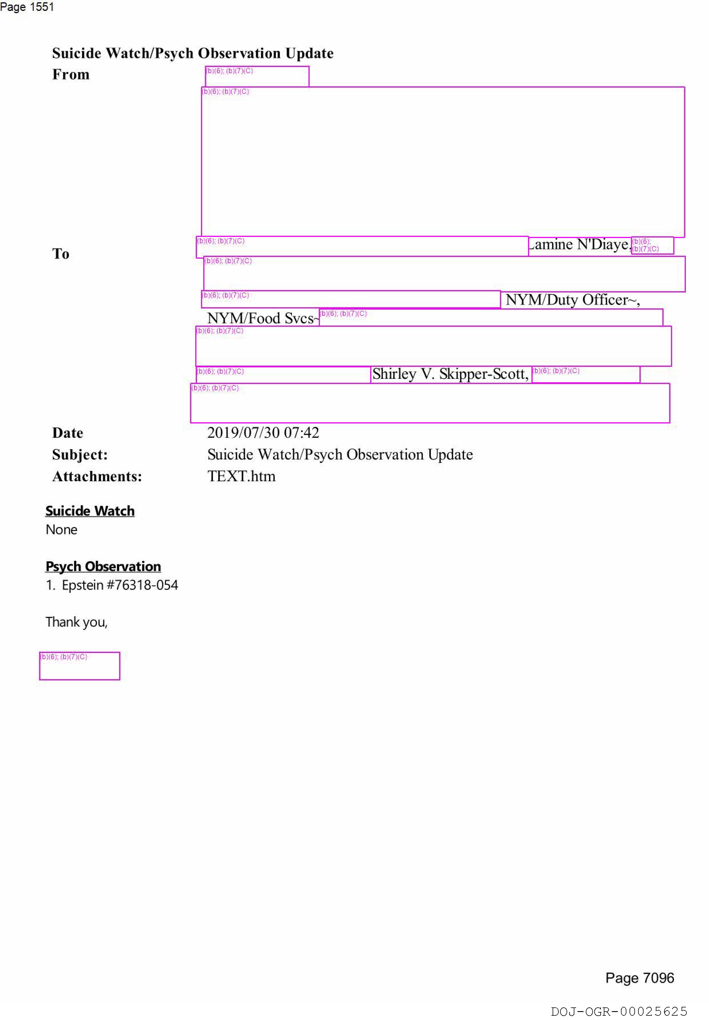 The image displays a scanned document with visible text and some blacked-out sections. The text appears to be from an official letter or report, possibly related to a legal case given the references to "Judge" and "Courtroom." There are also mentions of names that have been redacted. However, without more context, it's not possible to determine the exact nature of the document. The text is printed in black ink on a white background, indicating a standard typewritten format.