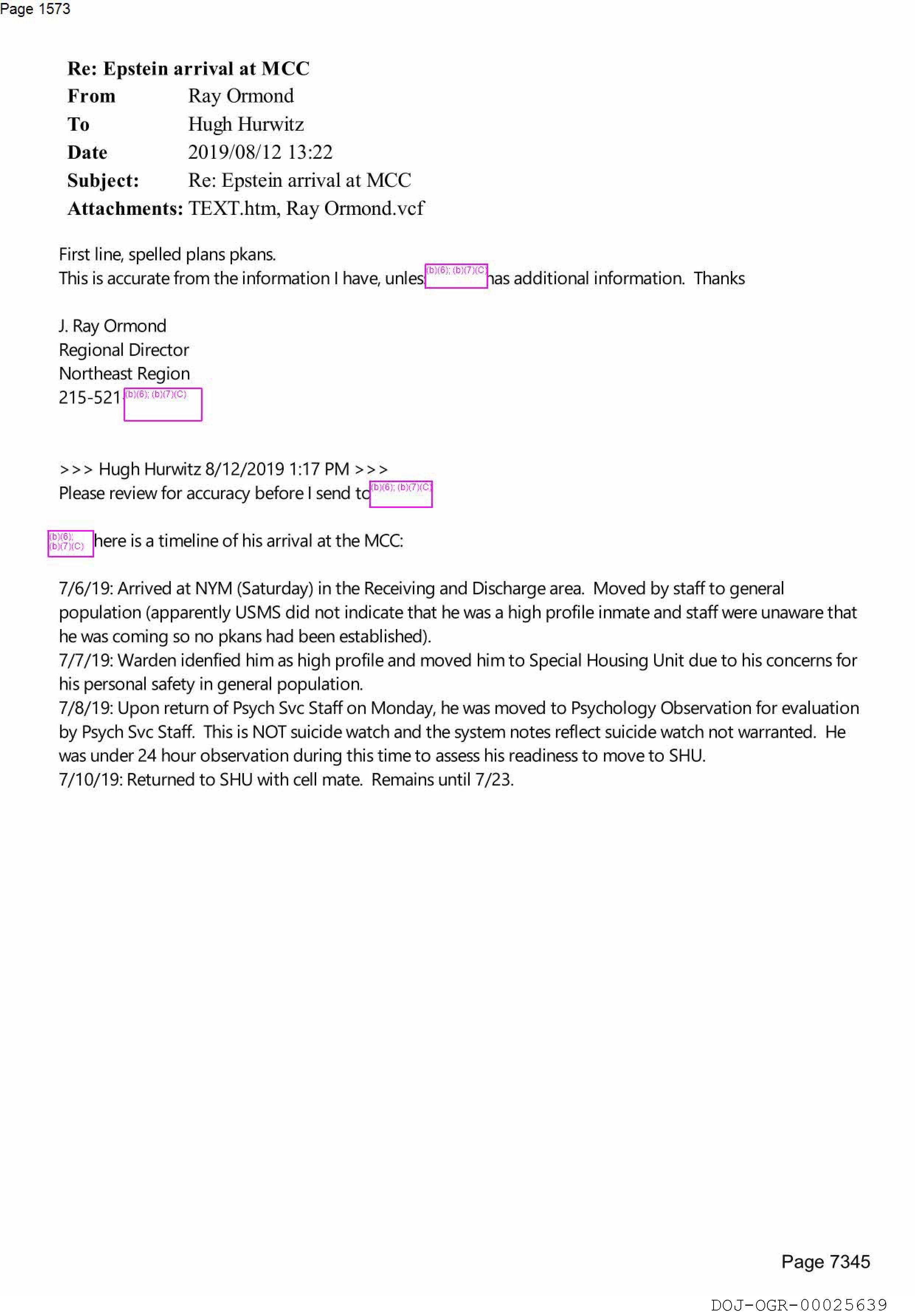 The image displays a scanned document with visible text and some blacked-out sections. The text appears to be from an official letter or report, possibly related to a legal case given the references to "Judge" and "Courtroom." There are also mentions of names that have been redacted. However, without more context, it's not possible to determine the exact nature of the document. The text is printed in black ink on a white background, indicating a standard typewritten format.