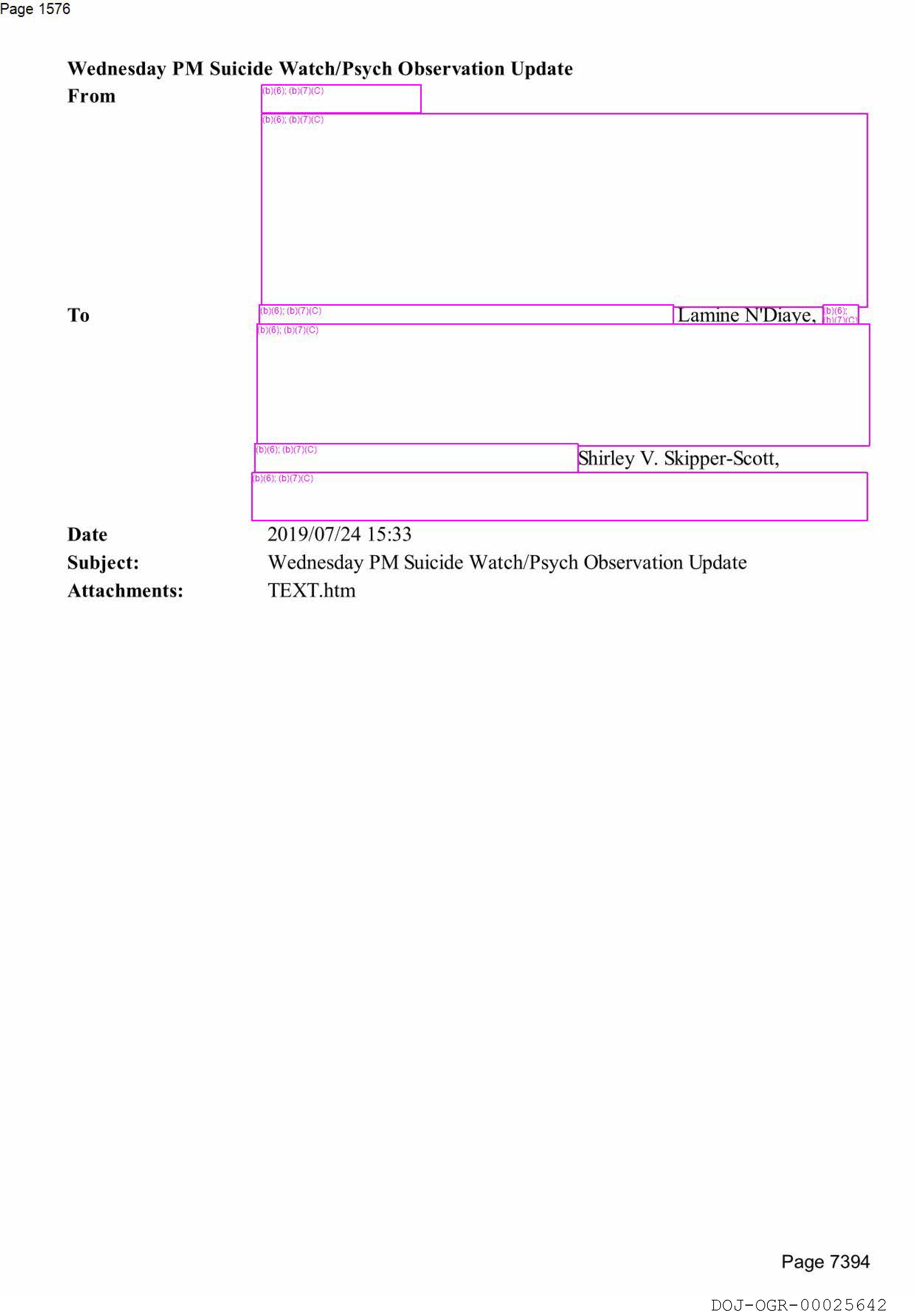 The image displays a scanned document with visible text and some blacked-out sections. The text appears to be from an official letter or report, possibly related to a legal case given the references to "Judge" and "Courtroom." There are also mentions of names that have been redacted. However, without more context, it's not possible to determine the exact nature of the document. The text is printed in black ink on a white background, indicating a standard typewritten format.