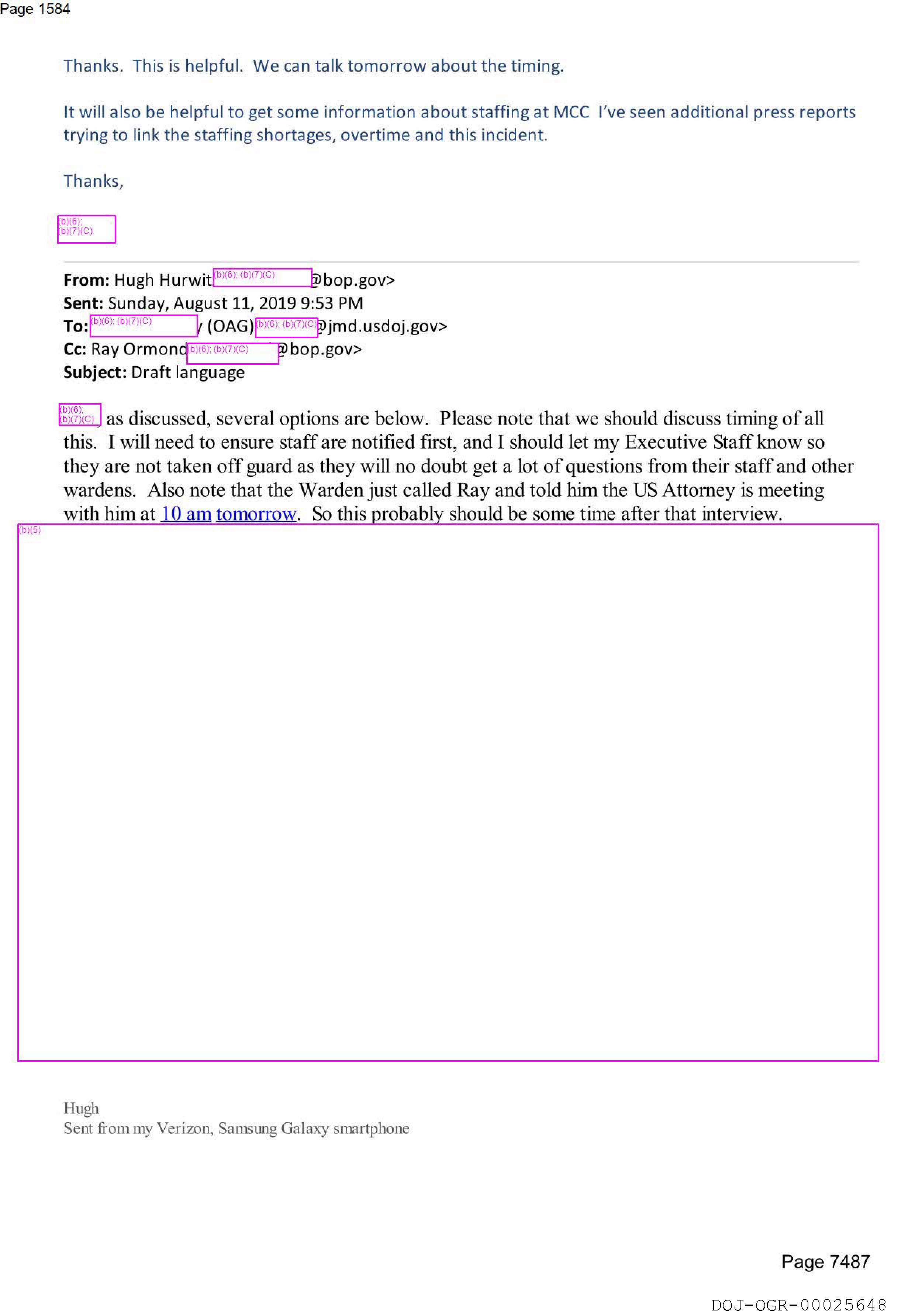 The image displays a scanned document with visible text and some blacked-out sections. The text appears to be from an official letter or report, possibly related to a legal case given the references to "Judge" and "Courtroom." There are also mentions of names that have been redacted. However, without more context, it's not possible to determine the exact nature of the document. The text is printed in black ink on a white background, indicating a standard typewritten format.