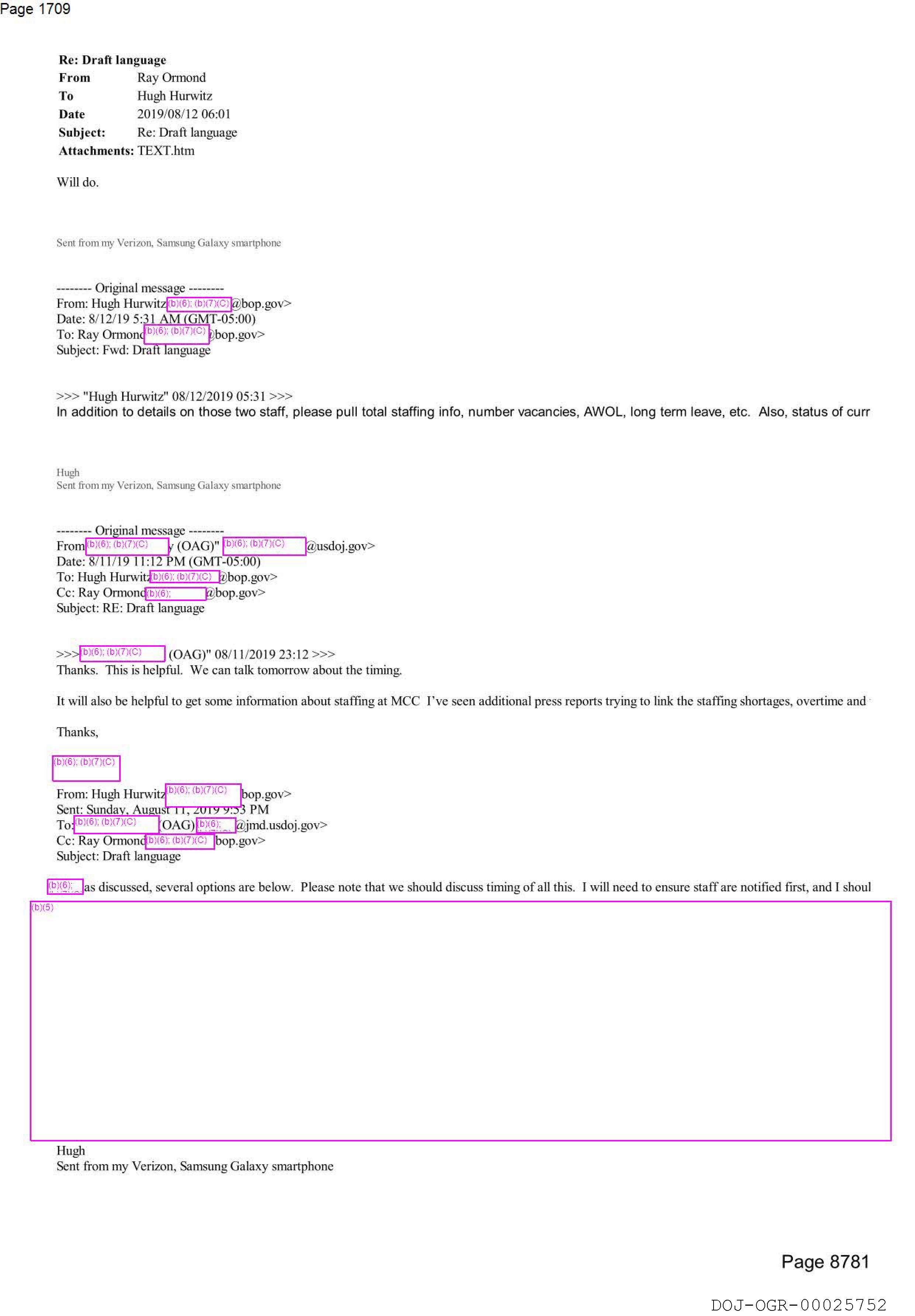The image appears to be a screenshot of an email thread with multiple participants and several layers of emails. The content is marked up with various colors, likely for emphasis, such as pink and blue highlighting. Specific details of the text are not clearly visible due to the resolution or angle at which the photo was taken. It's challenging to discern any personal information from this image because of the quality and the purposeful obfuscation through coloring.