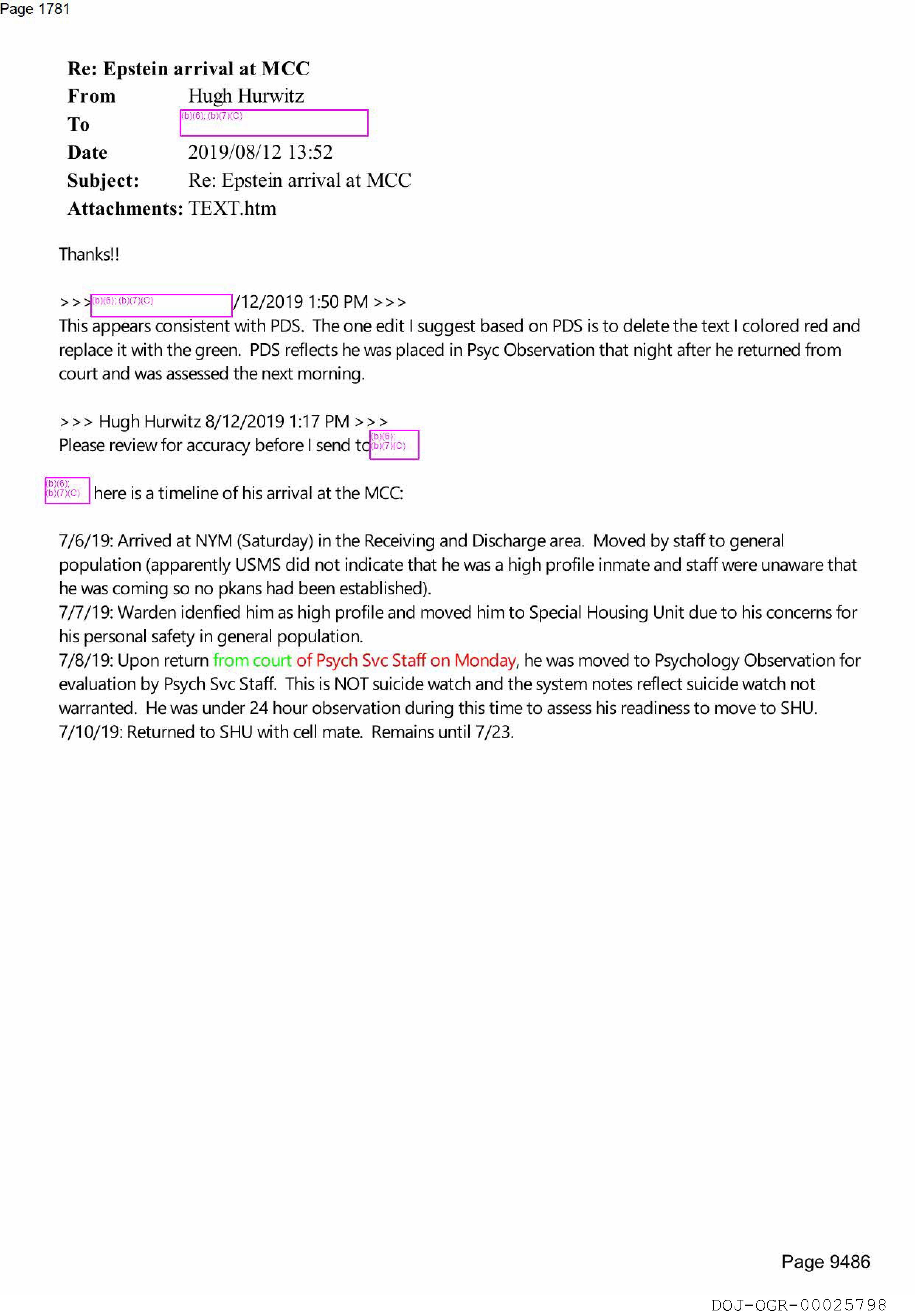 The image displays a scanned document with visible text and some blacked-out sections. The text appears to be from an official letter or report, possibly related to a legal case given the references to "Judge" and "Courtroom." There are also mentions of names that have been redacted. However, without more context, it's not possible to determine the exact nature of the document. The text is printed in black ink on a white background, indicating a standard typewritten format.