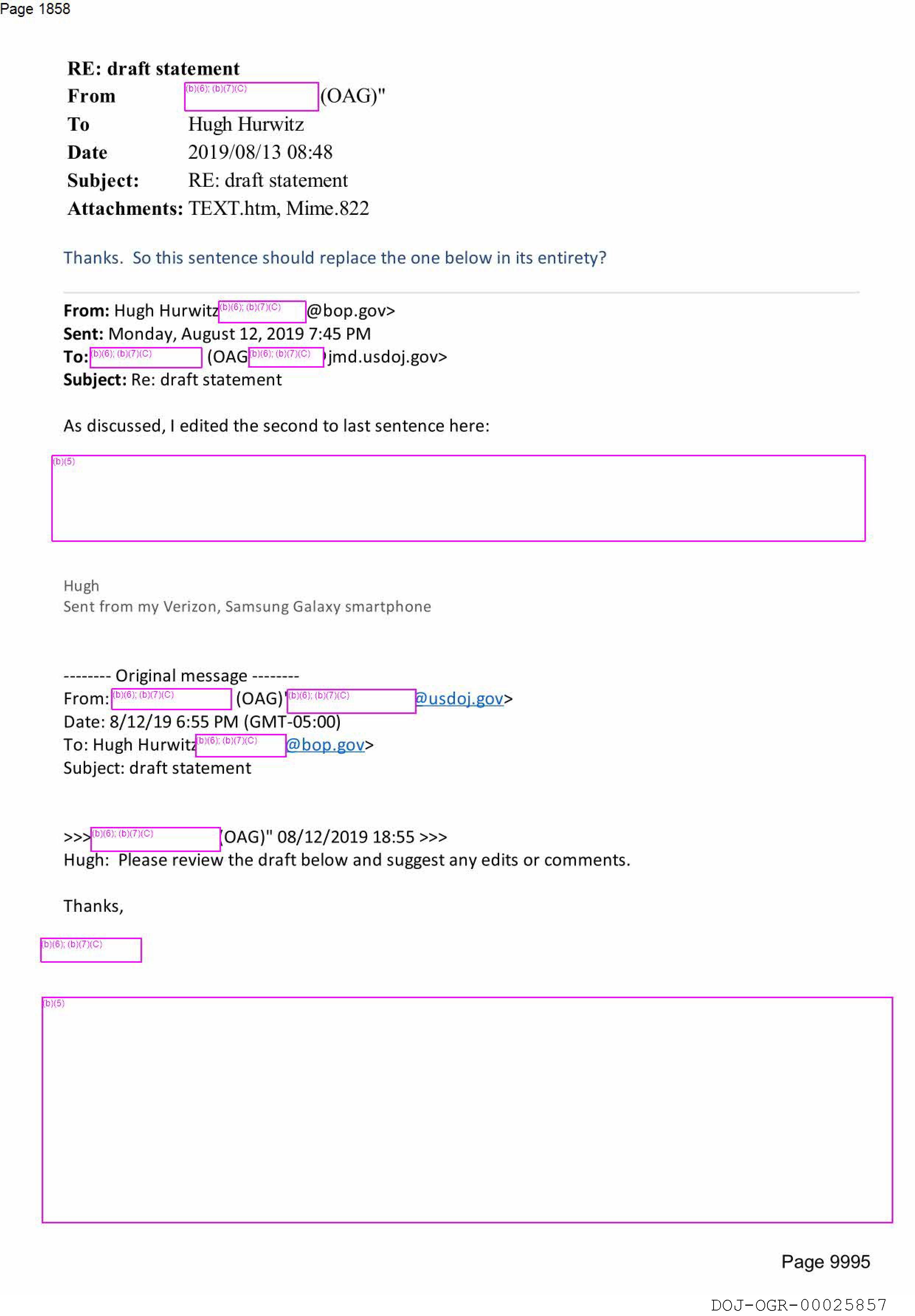 The image displays a computer screen showing an email message with several lines of text and some areas redacted with pink strikethroughs.