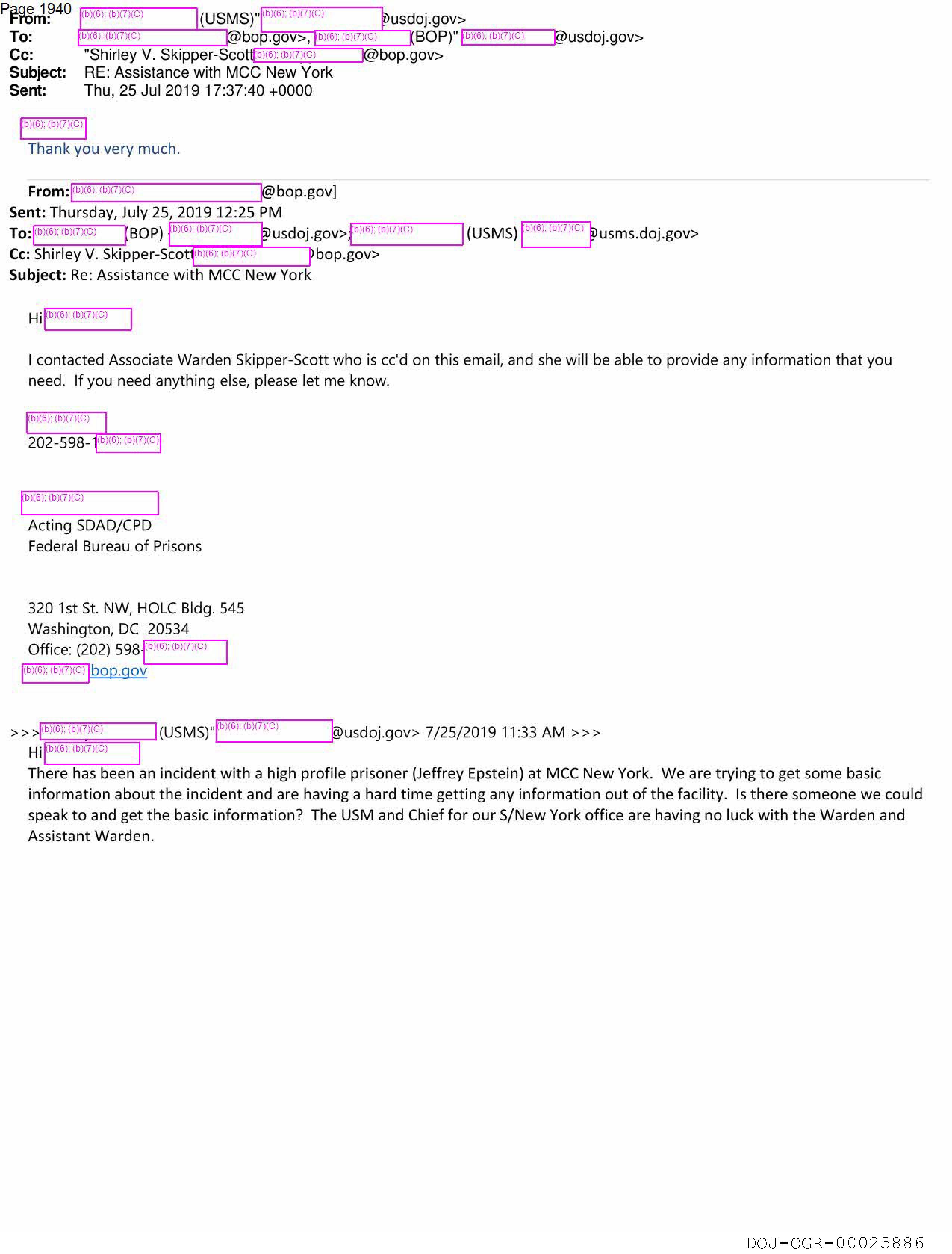 The image displays a scanned document with visible text and some blacked-out sections. The text appears to be from an official letter or report, possibly related to a legal case given the references to "Judge" and "Courtroom." There are also mentions of names that have been redacted. However, without more context, it's not possible to determine the exact nature of the document. The text is printed in black ink on a white background, indicating a standard typewritten format.