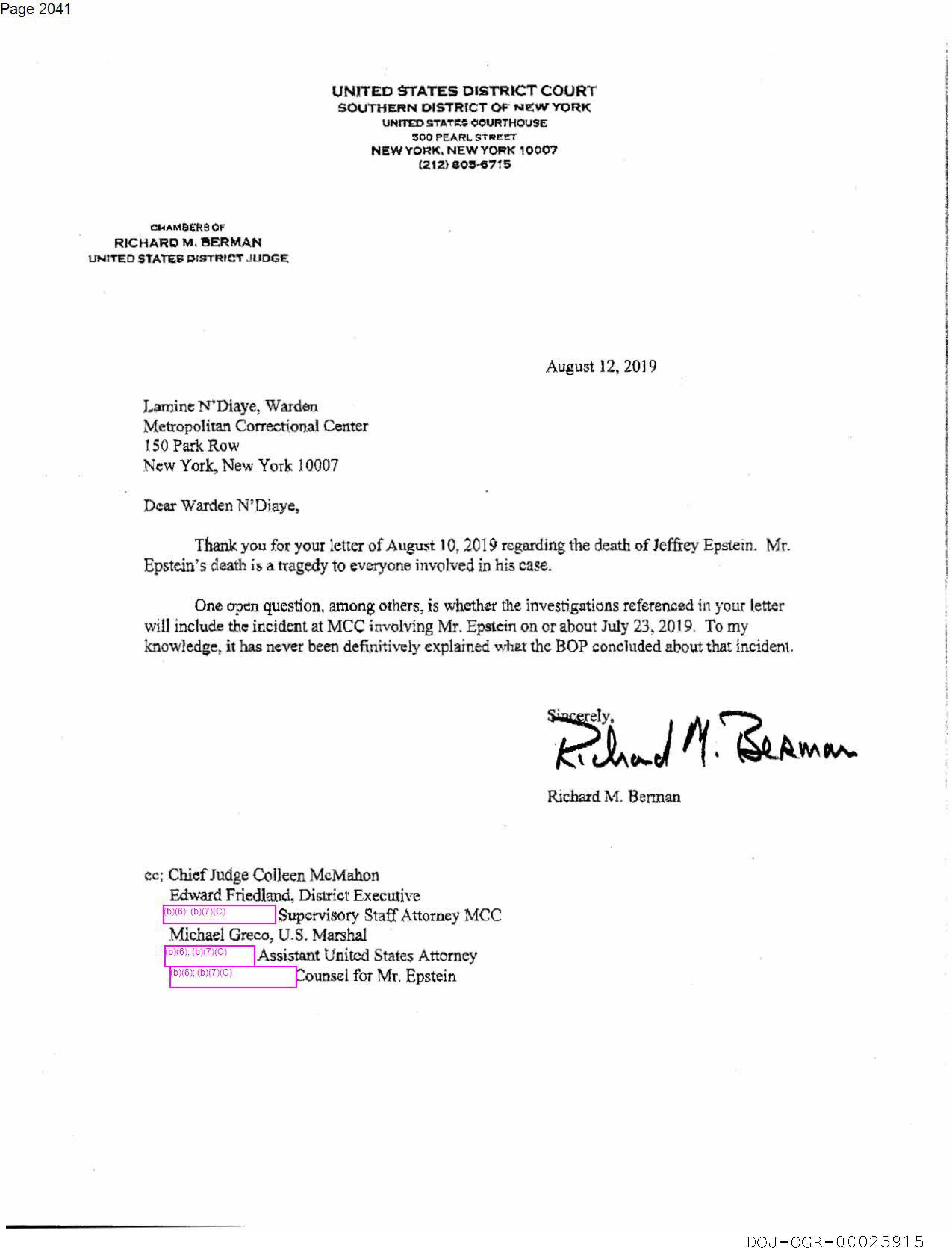The image displays a scanned document with visible text and some blacked-out sections. The text appears to be from an official letter or report, possibly related to a legal case given the references to "Judge" and "Courtroom." There are also mentions of names that have been redacted. However, without more context, it's not possible to determine the exact nature of the document. The text is printed in black ink on a white background, indicating a standard typewritten format.