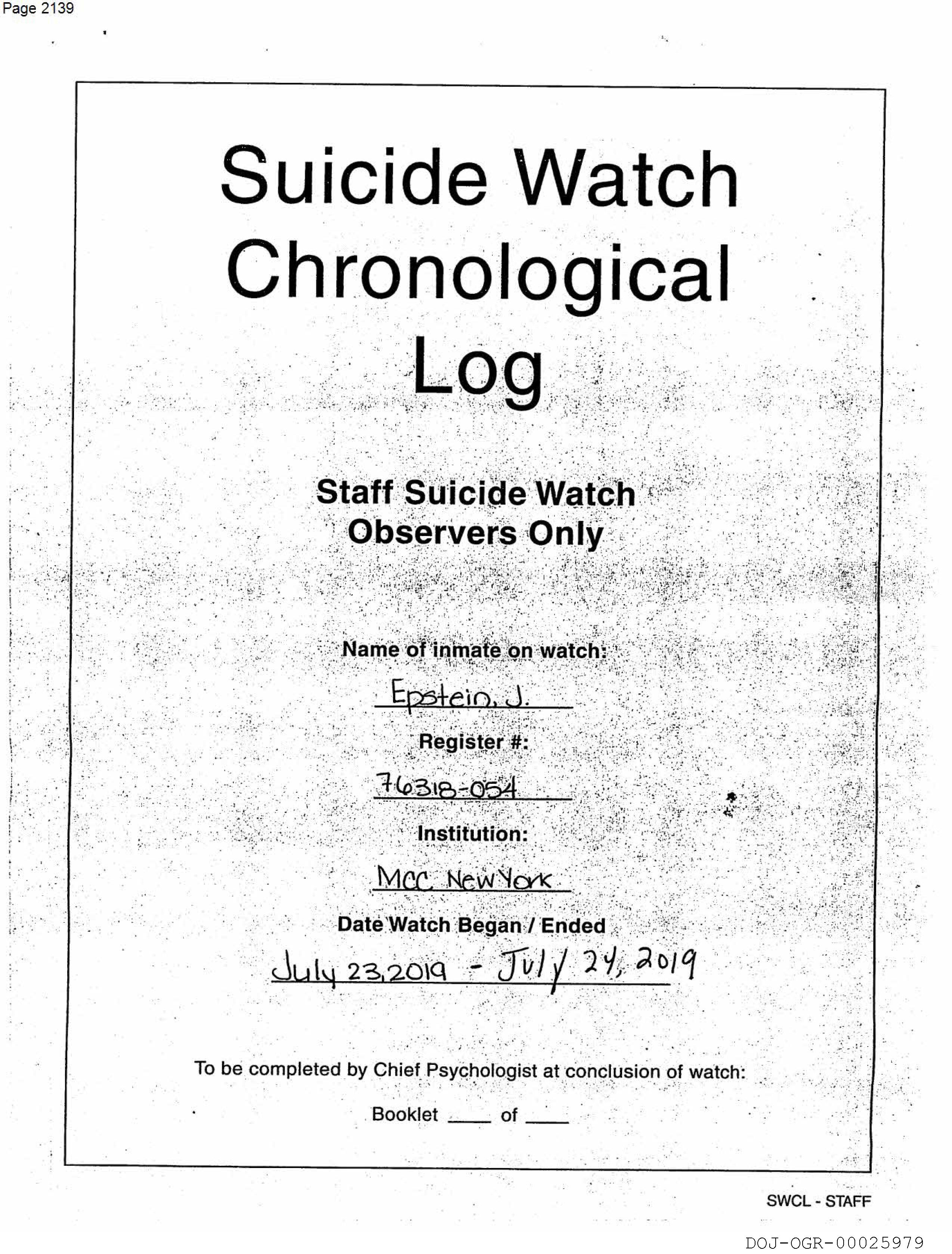The image shows a document titled "Staff Suicide Watch Chronological Log" with the words "Staff Suicide Watch" highlighted in red.