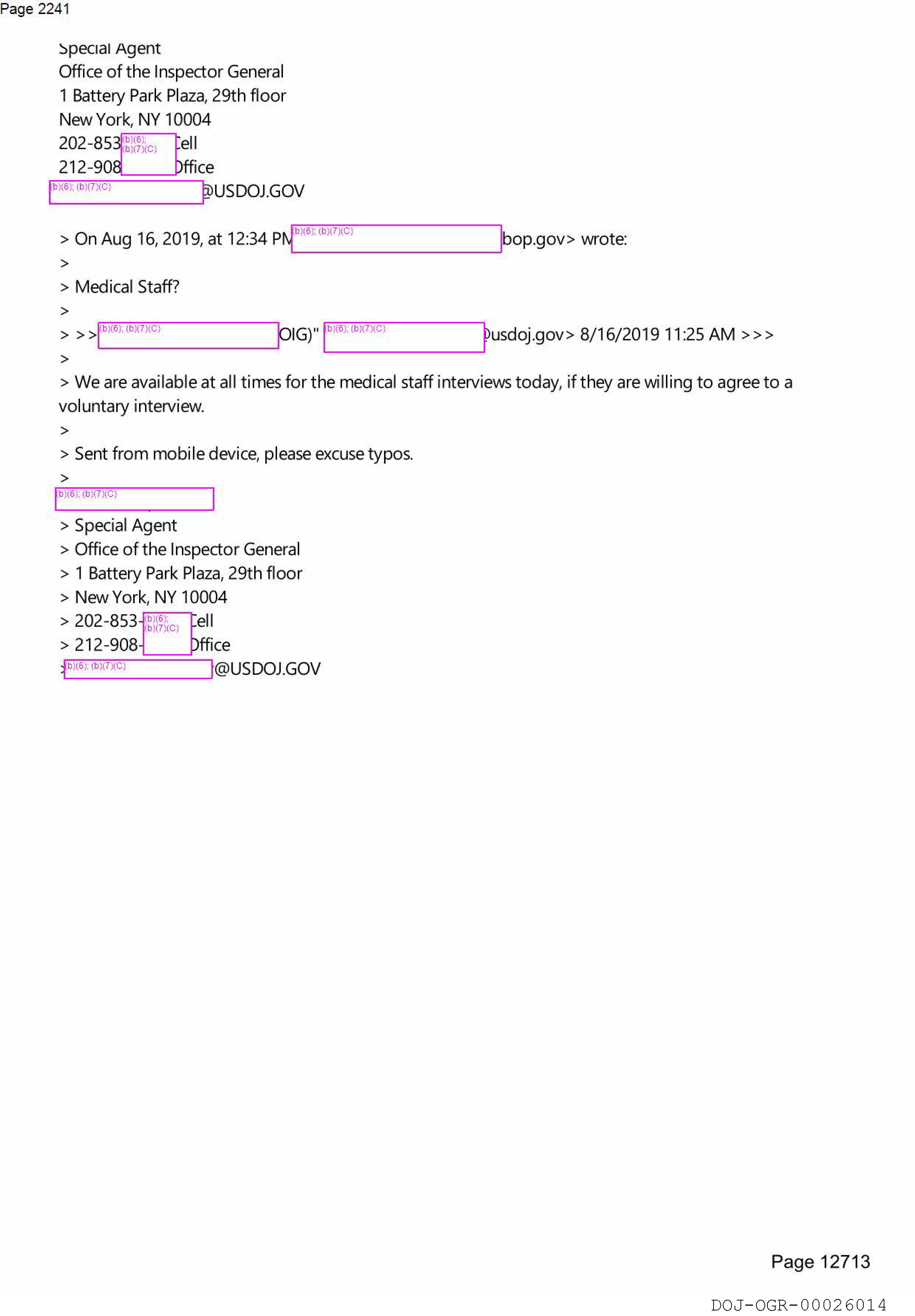 The image displays a scanned document with visible text and some blacked-out sections. The text appears to be from an official letter or report, possibly related to a legal case given the references to "Judge" and "Courtroom." There are also mentions of names that have been redacted. However, without more context, it's not possible to determine the exact nature of the document. The text is printed in black ink on a white background, indicating a standard typewritten format.