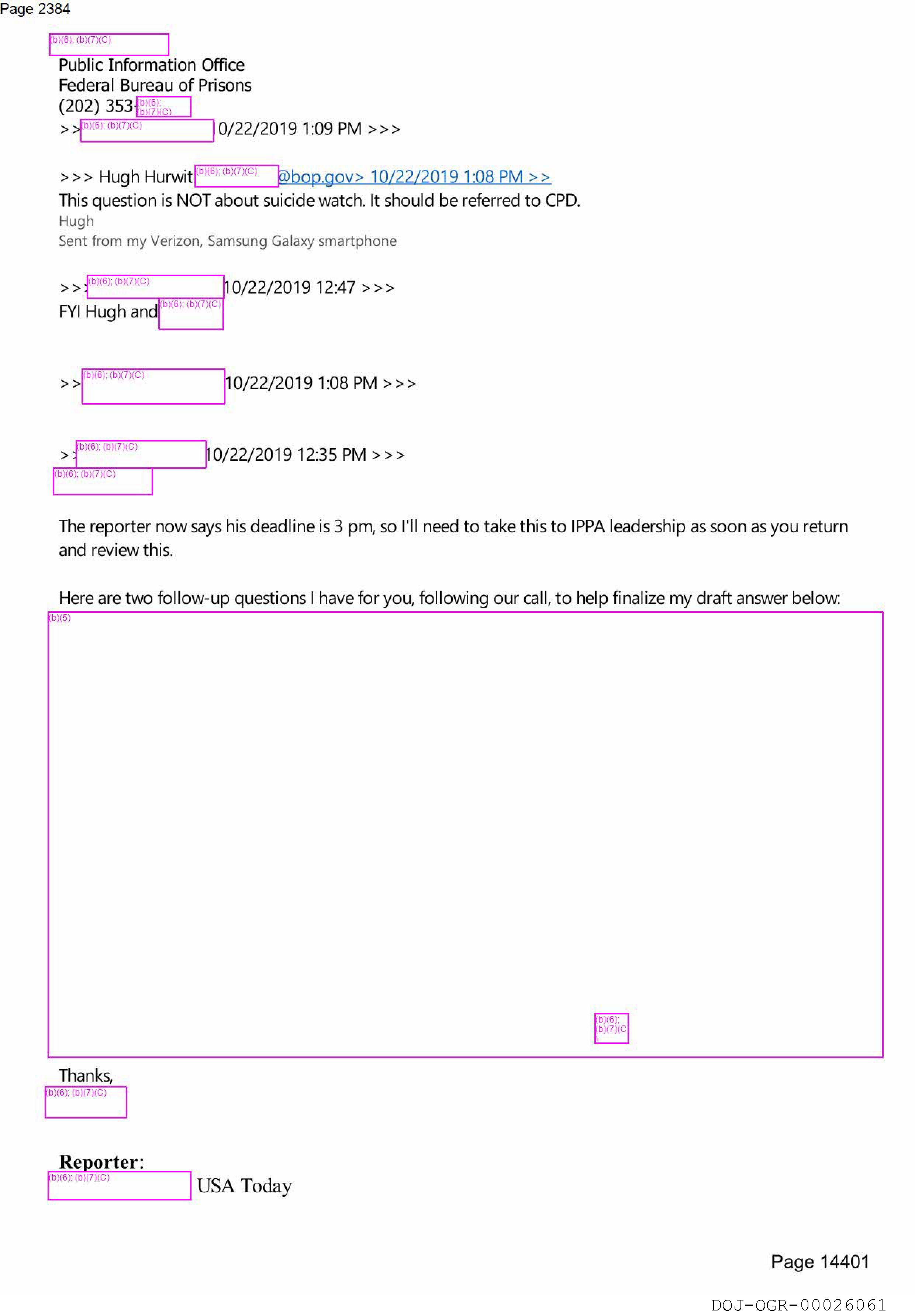 The image displays a scanned document with visible text and some blacked-out sections. The text appears to be from an official letter or report, possibly related to a legal case given the references to "Judge" and "Courtroom." There are also mentions of names that have been redacted. However, without more context, it's not possible to determine the exact nature of the document. The text is printed in black ink on a white background, indicating a standard typewritten format.