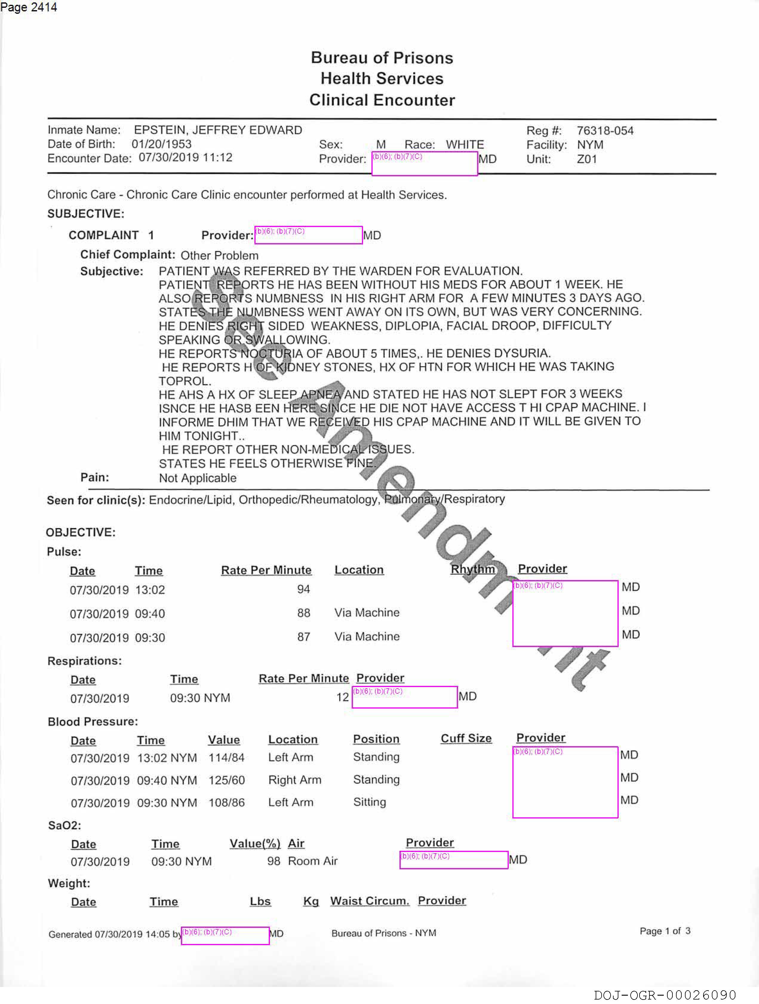 The image shows a printed document with the title "BOARD OF PRISONS CLINICAL ENCOUNTER" at the top.