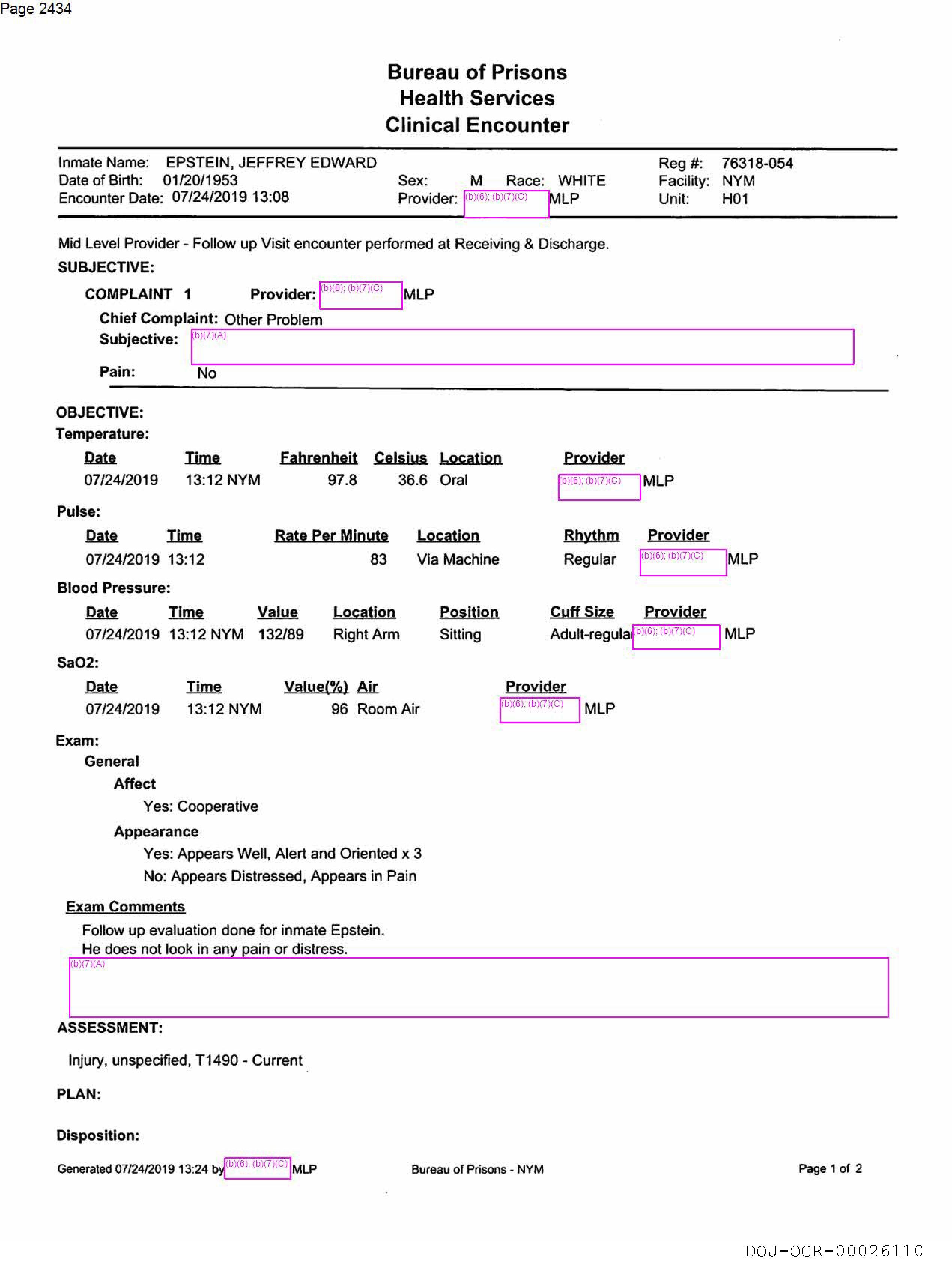 The image is a photograph of an official document with various fields filled out, including the title "Department of Corrections Clinical Encounter" at the top.