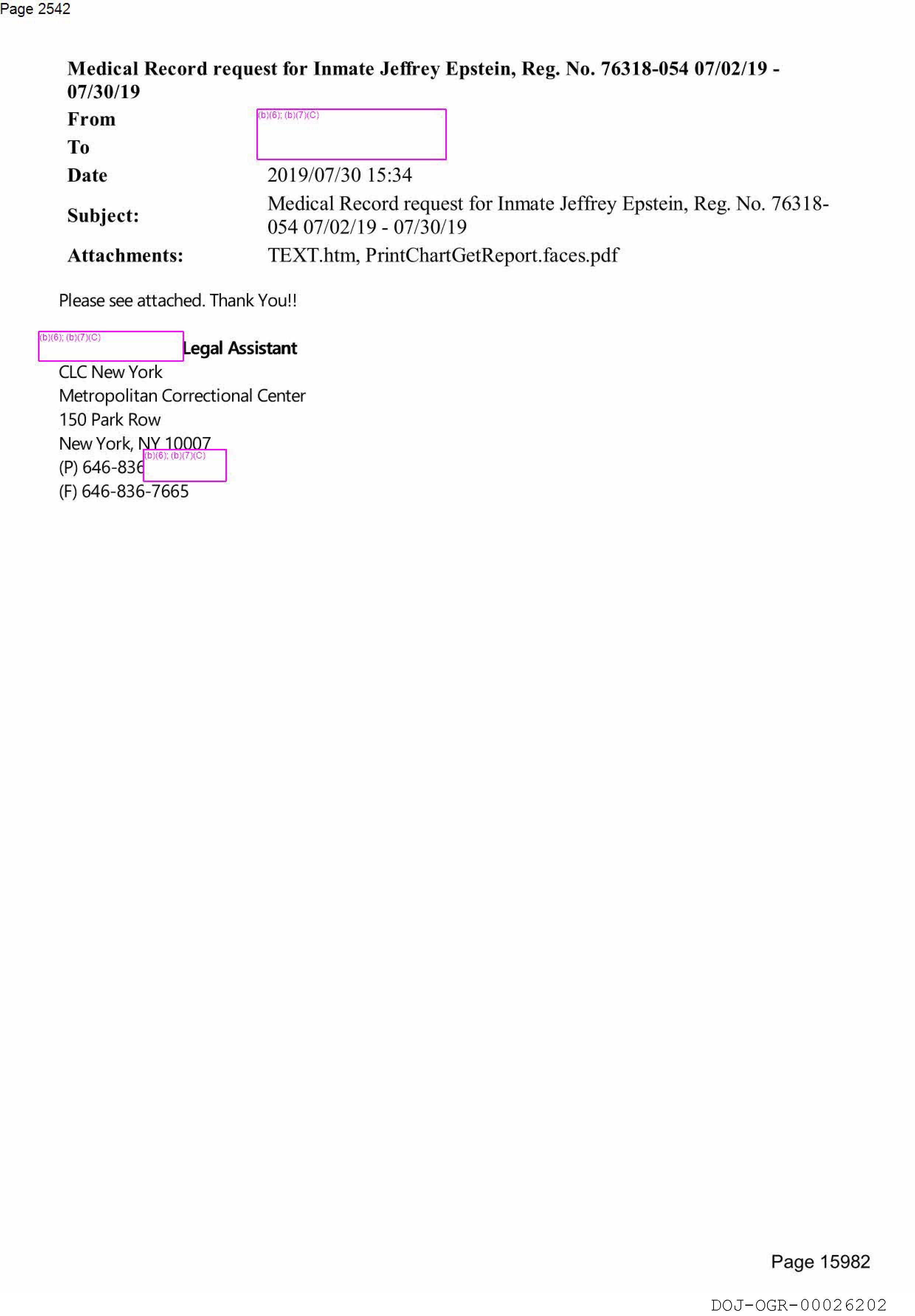 The image displays a scanned document with visible text and some blacked-out sections. The text appears to be from an official letter or report, possibly related to a legal case given the references to "Judge" and "Courtroom." There are also mentions of names that have been redacted. However, without more context, it's not possible to determine the exact nature of the document. The text is printed in black ink on a white background, indicating a standard typewritten format.