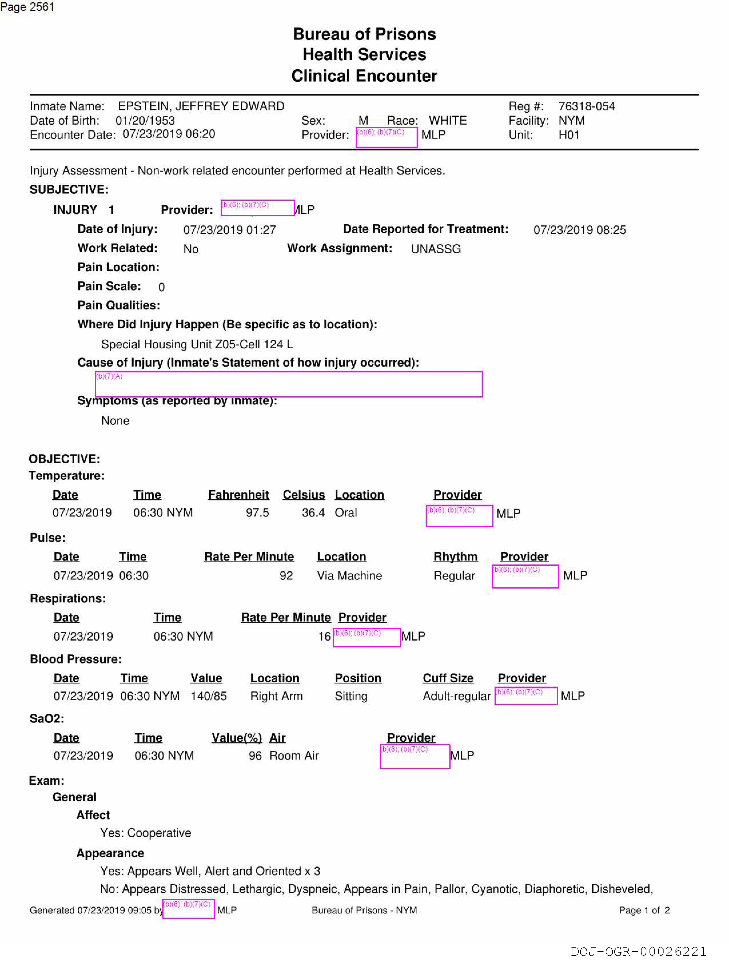 The image displays a document titled "Injury Assessment" from the Bureau of Prisons Health Services.