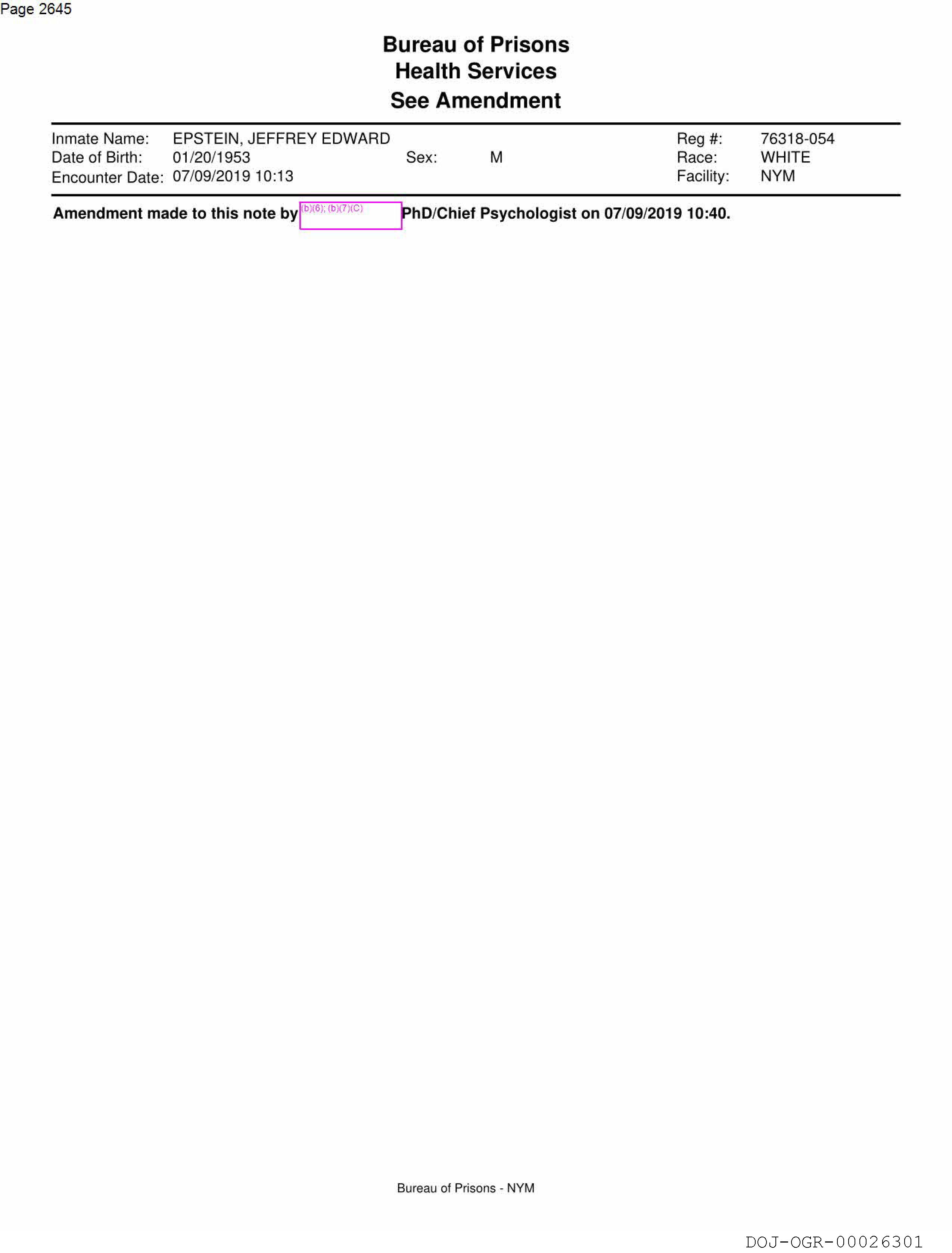 The image appears to be a photograph of a printed document, likely an official form or report from the "Bureau of Prisons Health Services" dated July 2013.
