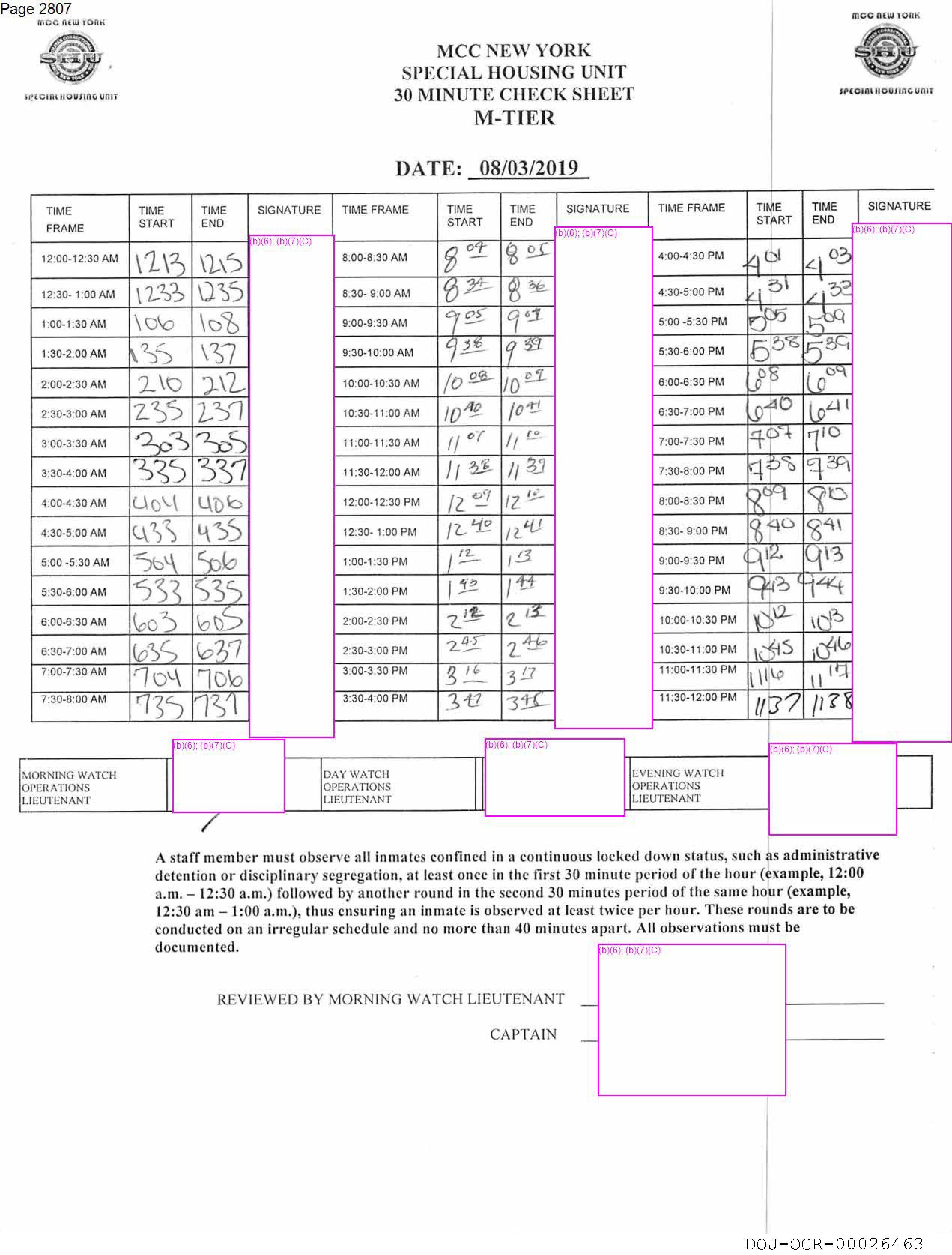The image appears to be a photograph of a document with several pieces of information printed on it. At the top, there is text that reads "MICHELLE MURRAY" and below it says "SPECIAL HOUSING FACILITIES COORDINATOR." The date at the bottom left corner indicates "May 2019." There are various columns with headings such as "Date," "Time," "Name," "Location," "Purpose," and numbers that might represent counts or measurements associated with different days and events. The document seems to be a log of activities or incidents for a specific period, possibly within a facility or organization under the supervision of Michelle Murray.