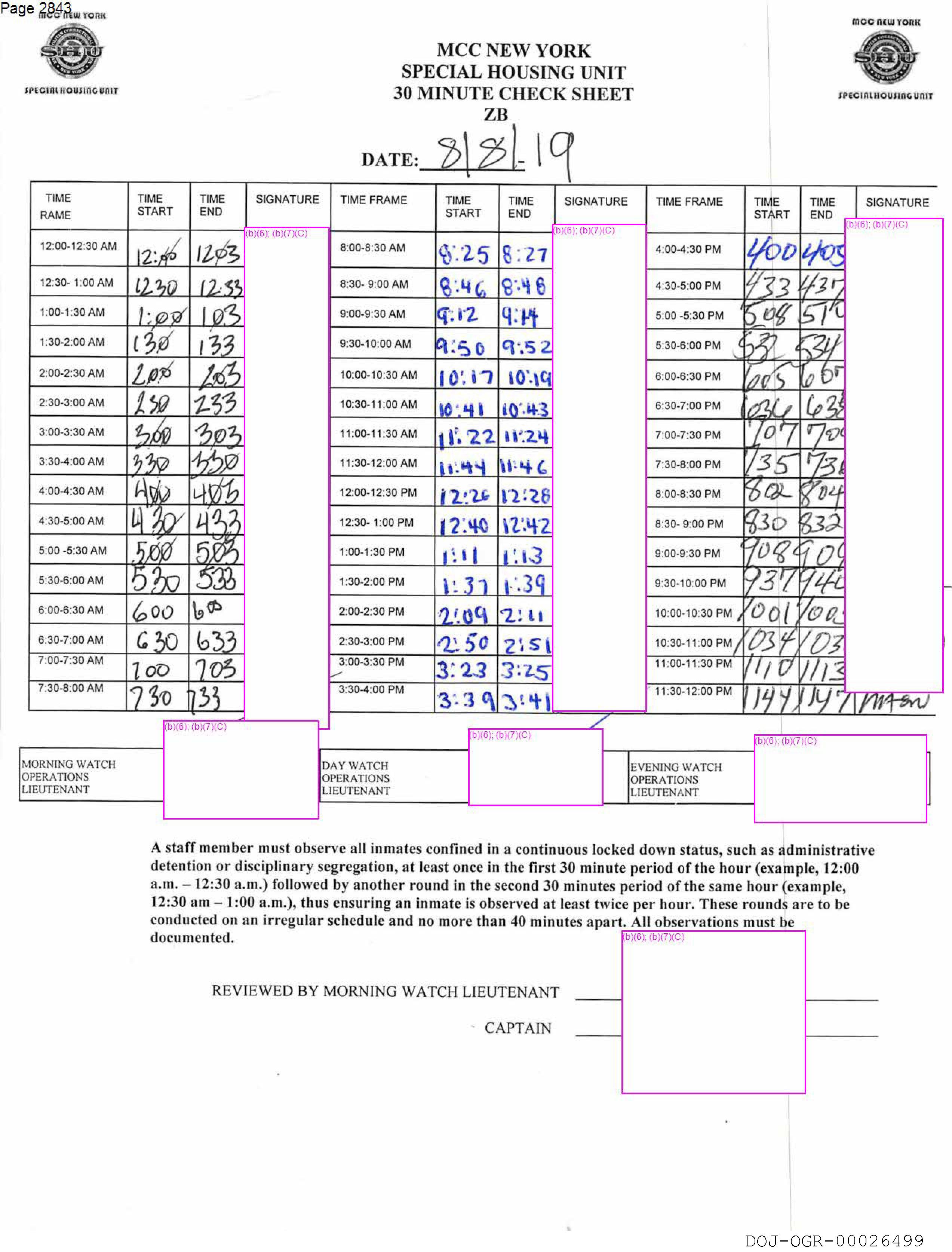 The image appears to be a scanned document with a table of data, possibly related to scheduling shifts or appointments due to the presence of timeslots and various numerical values. There is visible text that includes dates such as "3/15" and numbers like "9:00AM" which suggest that this could be a schedule or time tracking chart for an event or activity scheduled on March 15th. The document has some handwritten annotations, with one of the entries crossed out and another written in by hand, indicating changes to the original printed schedule. There is also a note at the bottom that seems to be signed, although the details are not clear due to the image's resolution and angle.