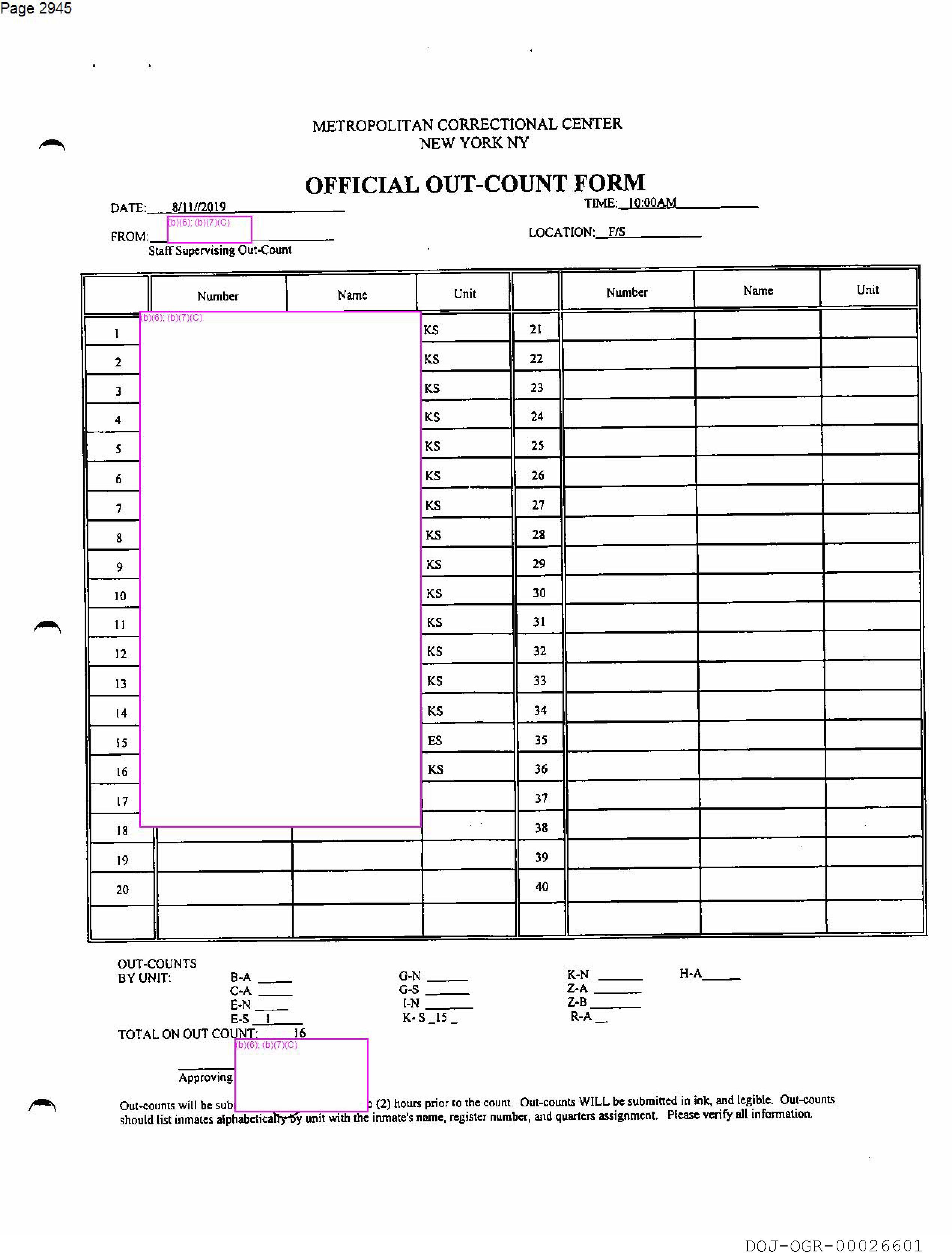 The image displays an official document titled "OFFICIAL OUT COUNT FORM" with a table and multiple lines filled out with handwritten numbers. The form includes columns for dates, names, or other identifiers, which are partially obscured. There is visible text in the document such as column headings, but specific details are not clear due to the angle and quality of the image. It seems to be a piece of paperwork that is likely used to track inventory or items going out from an organization or facility.