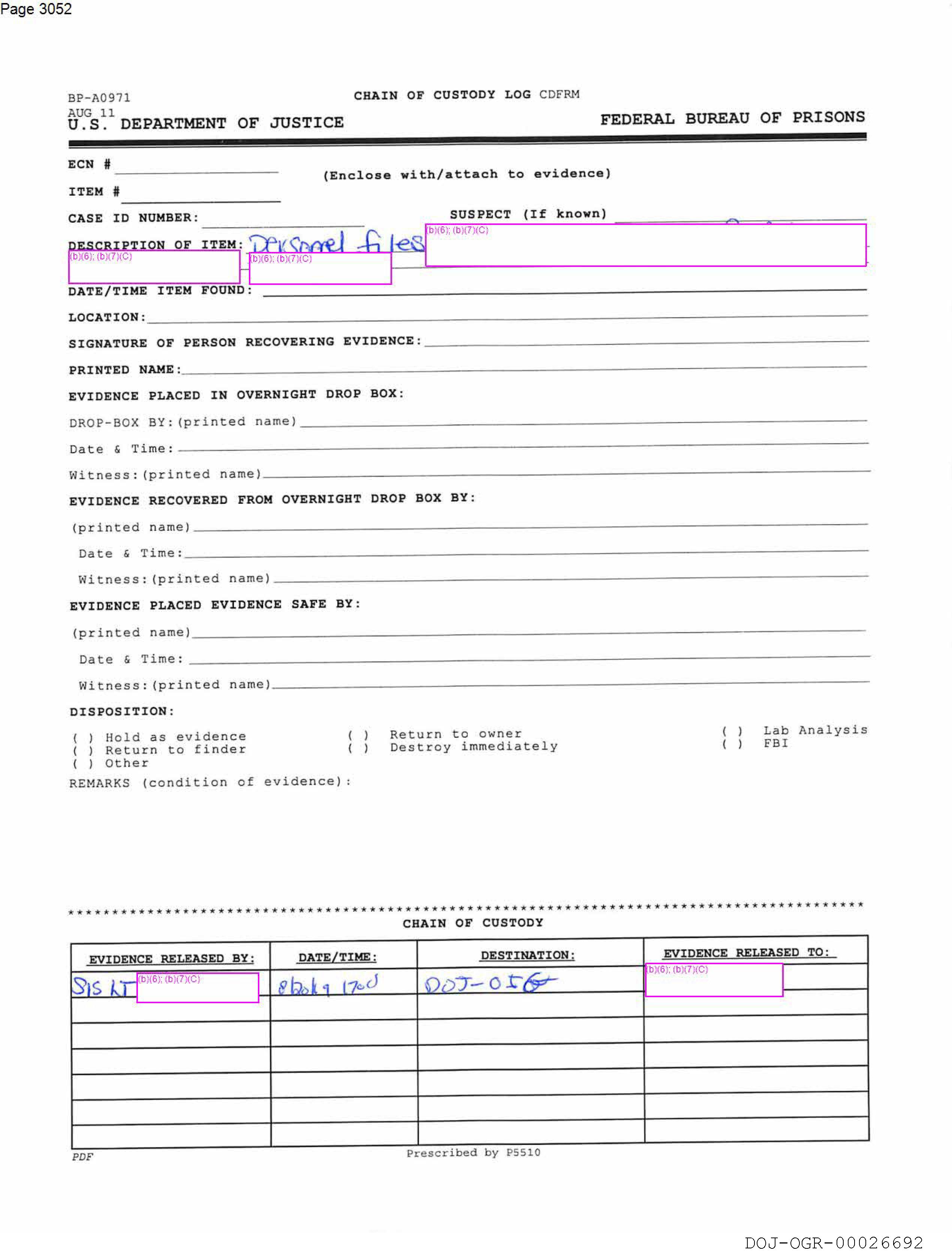 The image displays a scanned document with visible text and some blacked-out sections. The text appears to be from an official letter or report, possibly related to a legal case given the references to "Judge" and "Courtroom." There are also mentions of names that have been redacted. However, without more context, it's not possible to determine the exact nature of the document. The text is printed in black ink on a white background, indicating a standard typewritten format.