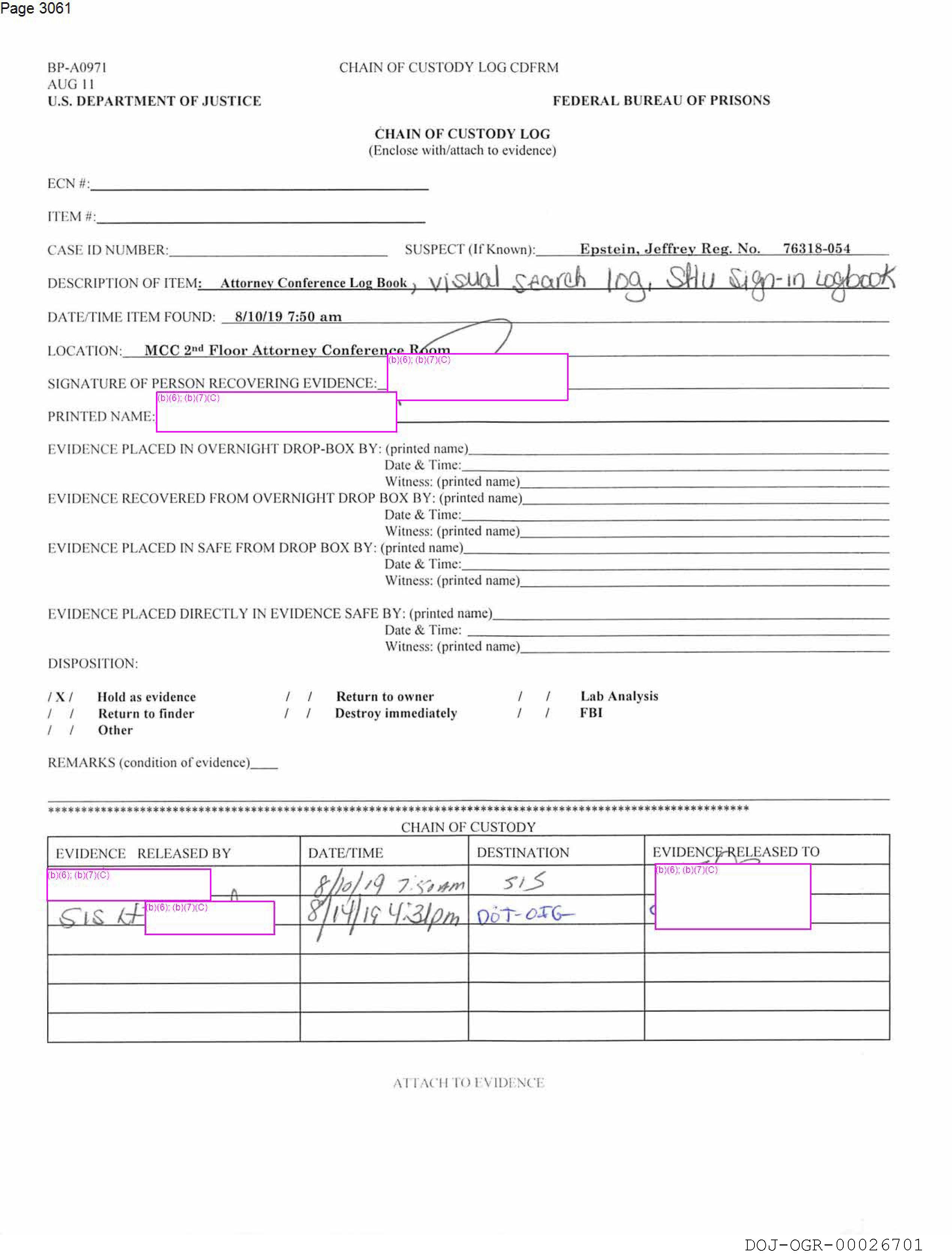 The image displays a piece of paper that appears to be an official document from the United States Department of Justice, specifically from the Office of the Executive Secretary.