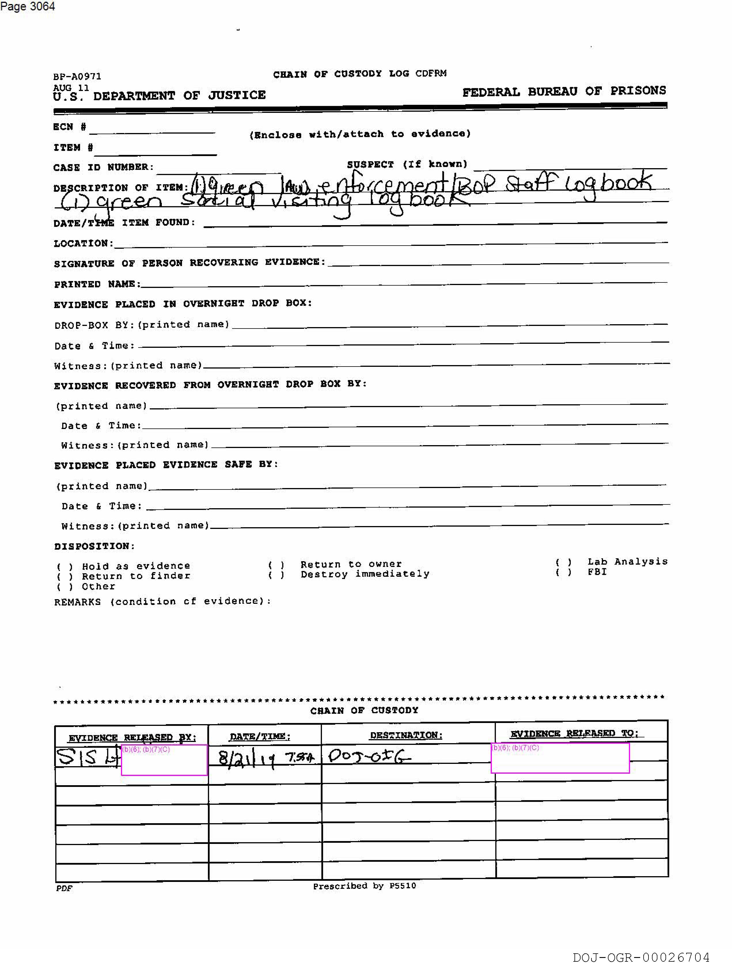 The image appears to be a photograph of a printed document from the Federal Bureau of Investigation (FBI). The top part of the document shows the FBI's official seal and logo. The document is partially redacted with black lines covering certain information, including names or other sensitive details that would typically identify individuals involved in an investigation. The visible text includes dates and references to legal proceedings such as "Case Number" and a court citation. There are also instructions for handling the document, indicating it is a restricted piece of evidence related to an ongoing case.