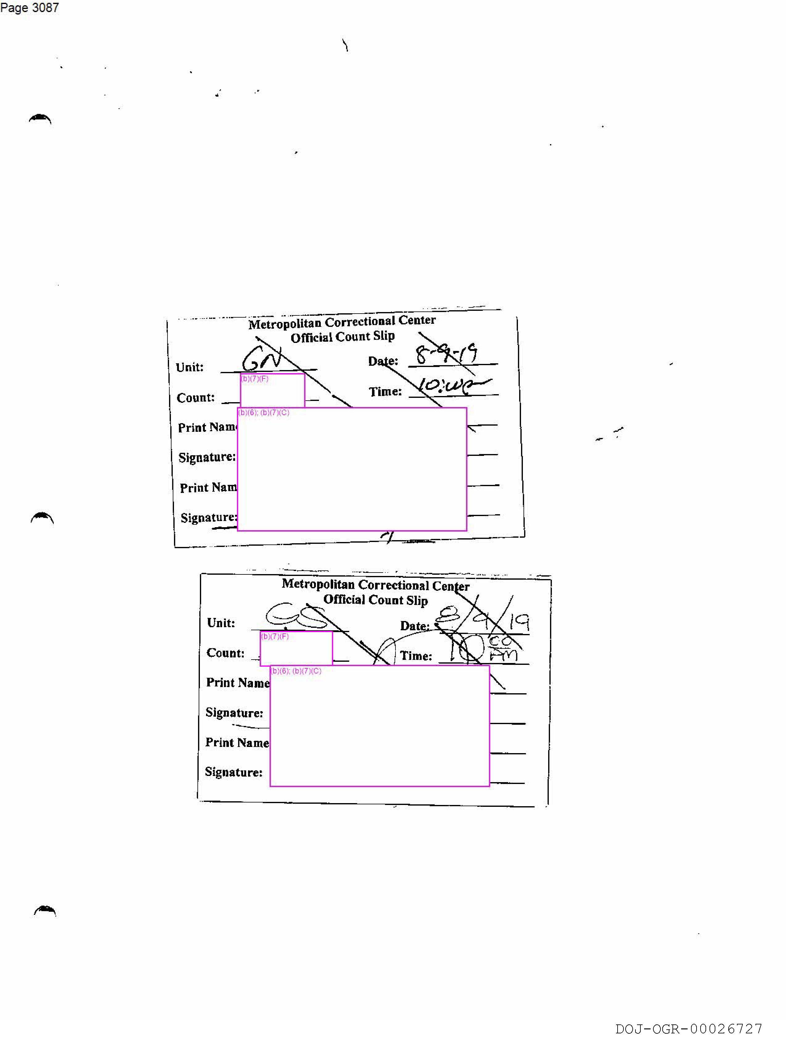 The image displays a scanned document with visible text and some blacked-out sections. The text appears to be from an official letter or report, possibly related to a legal case given the references to "Judge" and "Courtroom." There are also mentions of names that have been redacted. However, without more context, it's not possible to determine the exact nature of the document. The text is printed in black ink on a white background, indicating a standard typewritten format.