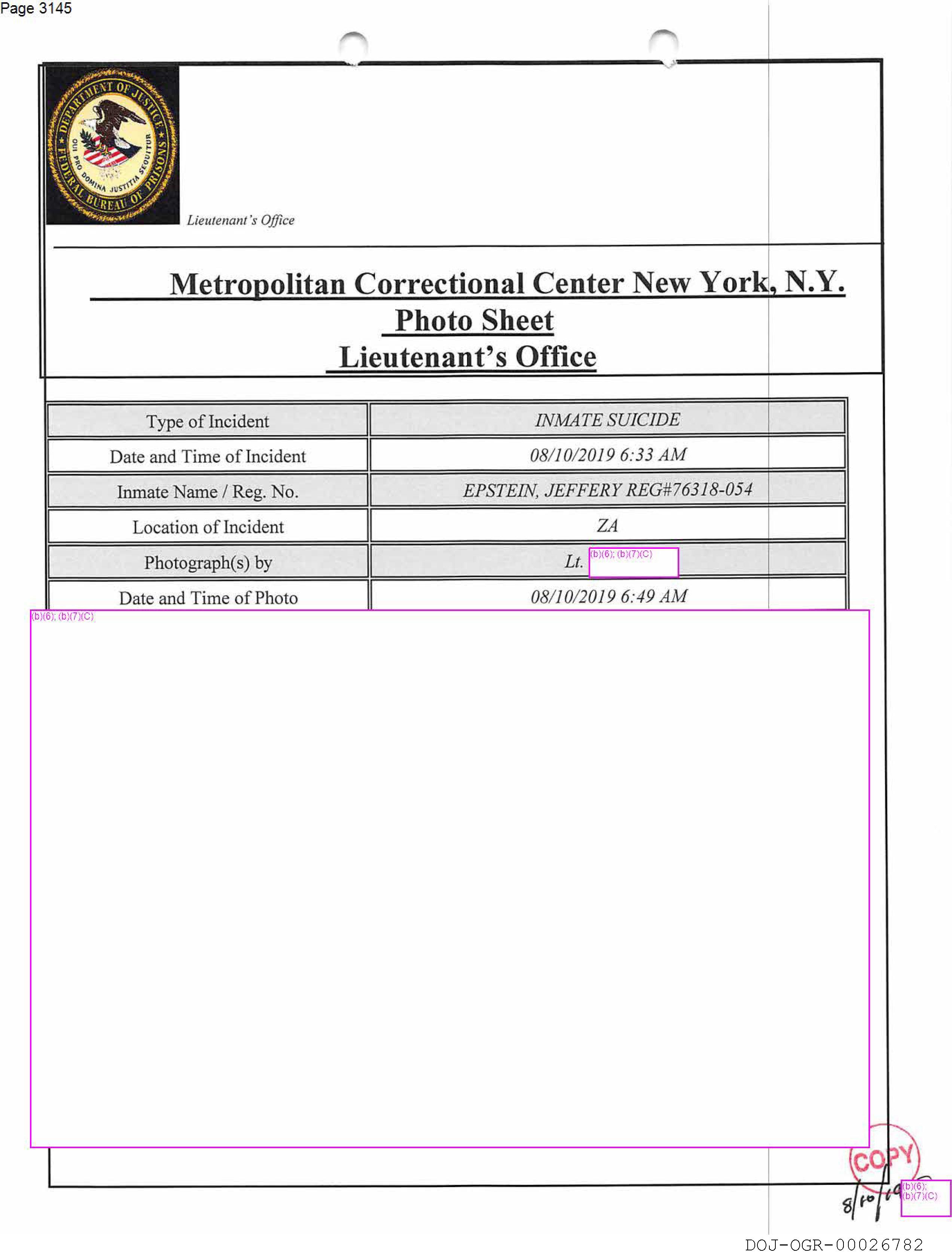 The image shows a printed document with a header that includes an emblem and the text "METROPOLITAN CORRECTIONAL CENTER NEW YORK NY" followed by the words "Photo Sheet" below it.