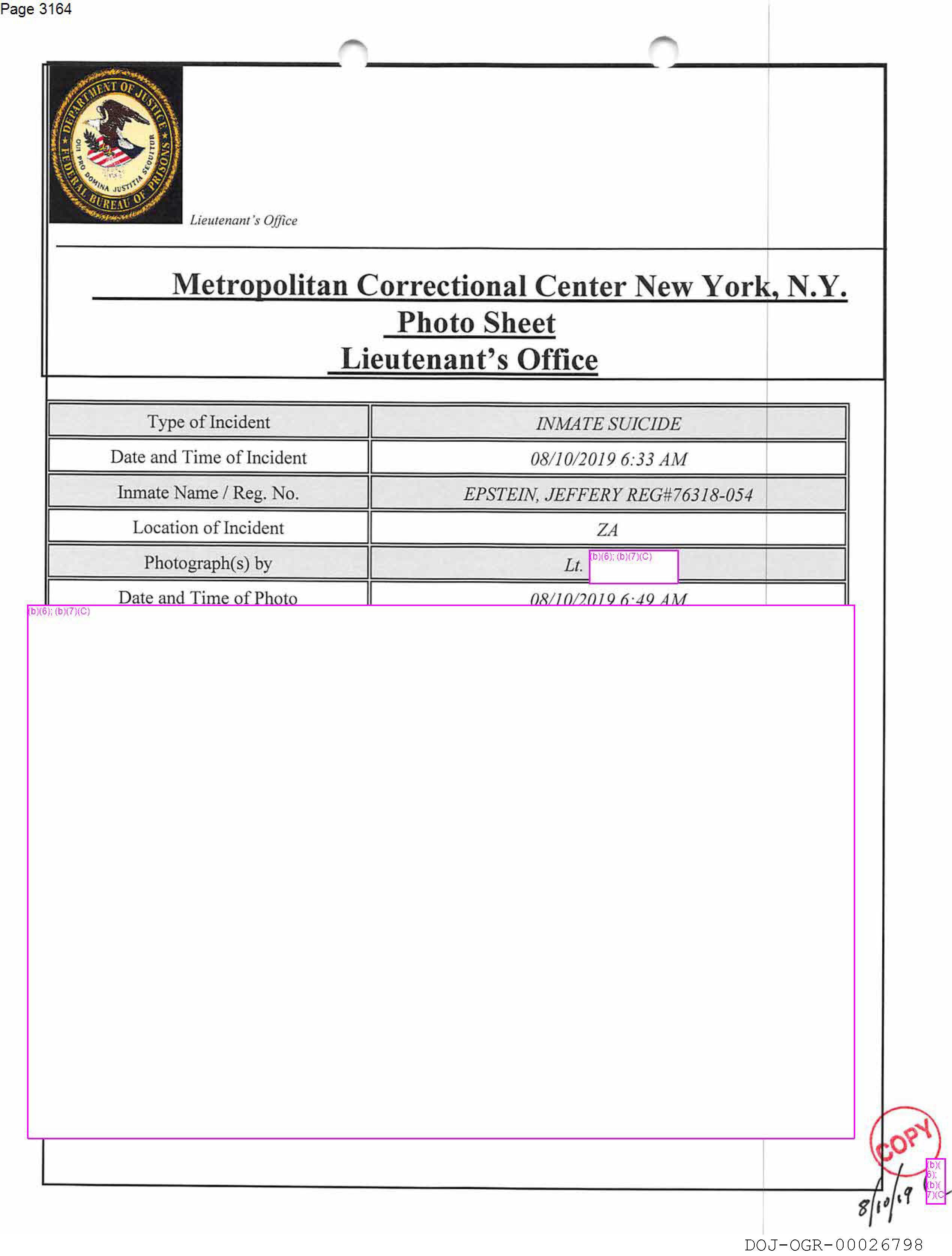 The image appears to be a photograph of an official document. At the top left corner, there is a logo followed by the name "Metropolitan Correctional Center New York NY". Below this heading, there's a section titled "Photo Shot Sheet" with several lines of text, possibly indicating instructions or information related to photographs taken within the facility. The document has various fields and checkboxes filled out in black ink. There is also a handwritten note in the bottom right corner that says "Approved" along with what seems like a signature, suggesting that this document has been reviewed and sanctioned by an authority figure.