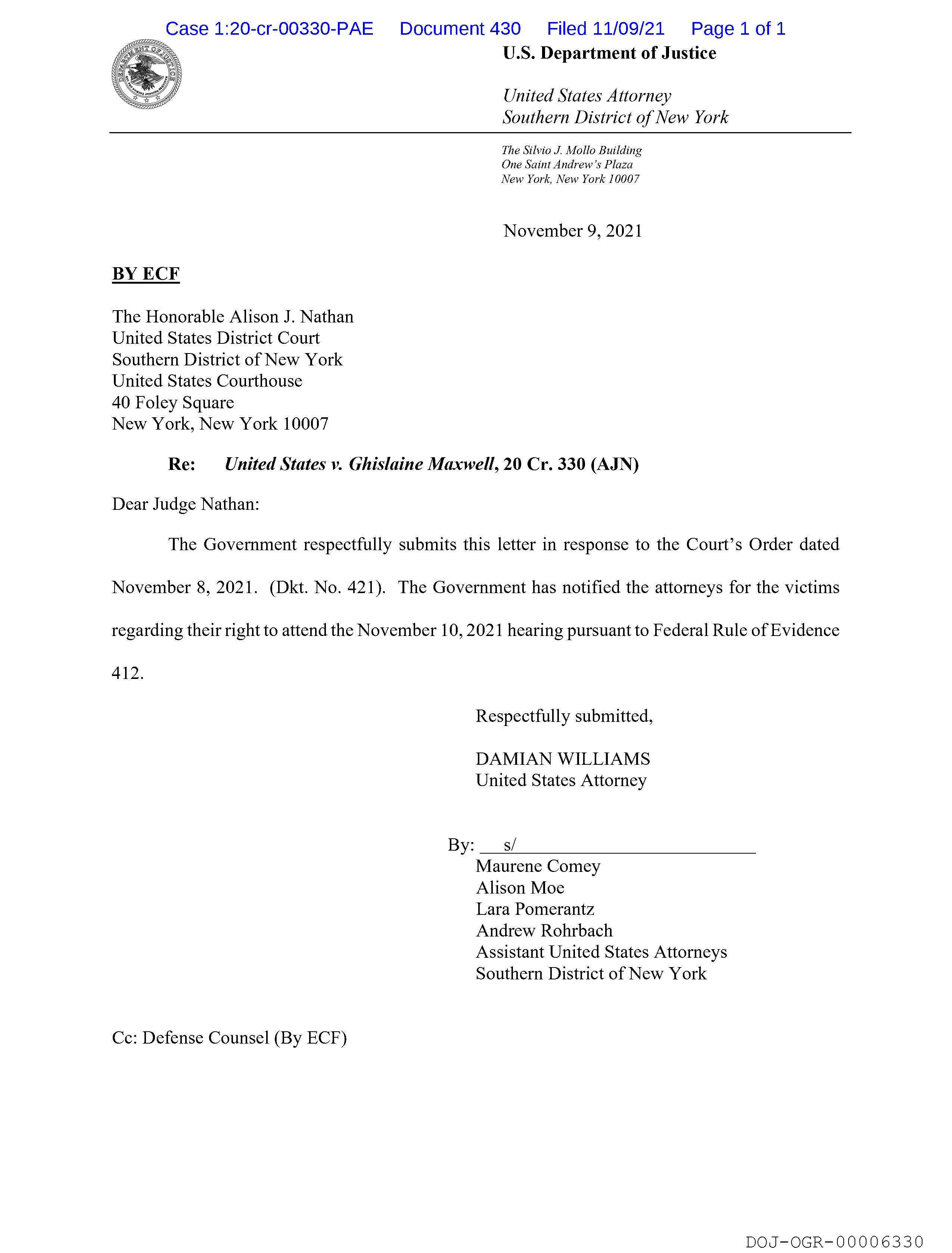 The image displays a scanned document with visible text and some blacked-out sections. The text appears to be from an official letter or report, possibly related to a legal case given the references to "Judge" and "Courtroom." There are also mentions of names that have been redacted. However, without more context, it's not possible to determine the exact nature of the document. The text is printed in black ink on a white background, indicating a standard typewritten format.