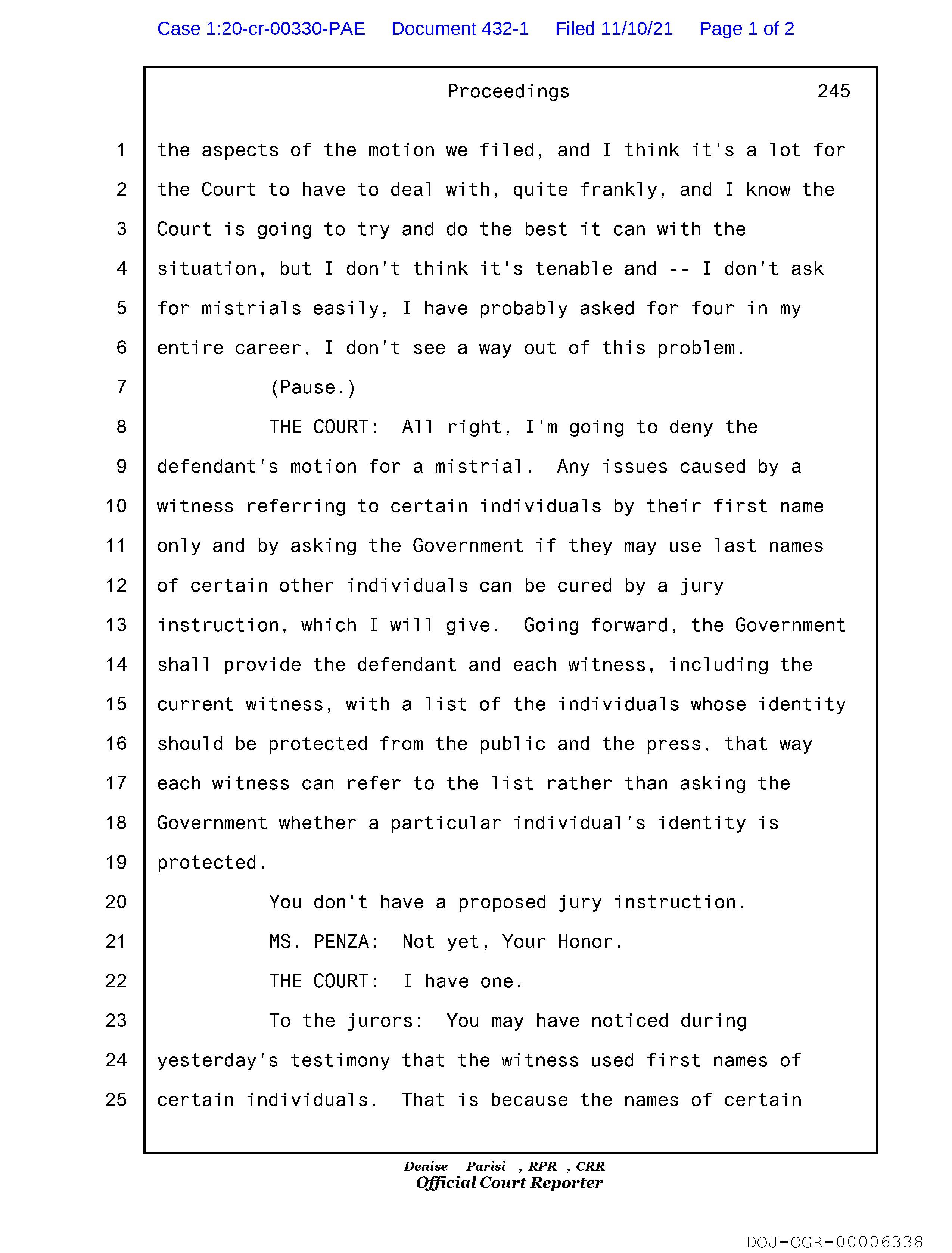 The image displays a scanned document with visible text and some blacked-out sections. The text appears to be from an official letter or report, possibly related to a legal case given the references to "Judge" and "Courtroom." There are also mentions of names that have been redacted. However, without more context, it's not possible to determine the exact nature of the document. The text is printed in black ink on a white background, indicating a standard typewritten format.