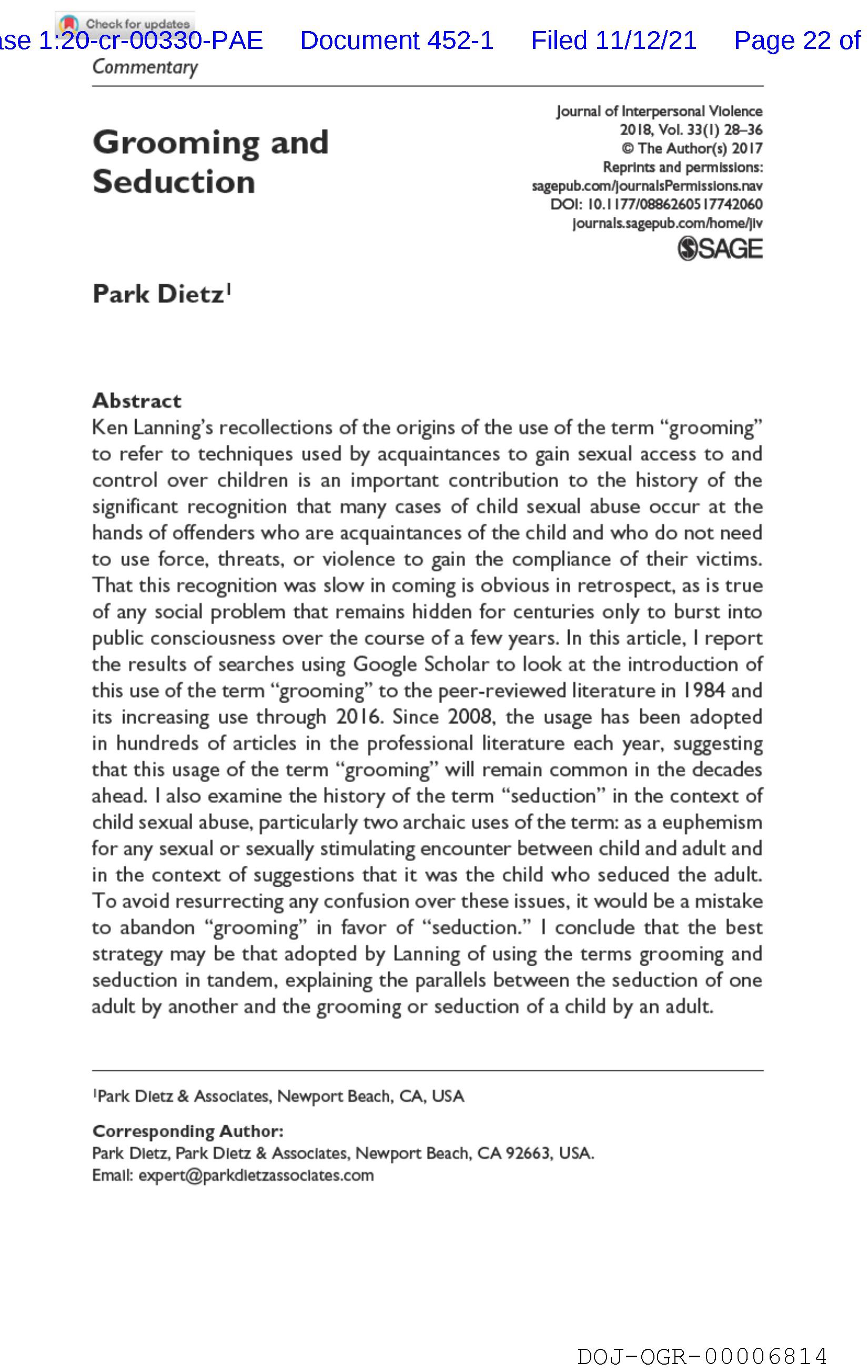 The image shows a close-up of printed text on a piece of paper. The print is small and appears to be from an article titled "Grooming and Seduction" which seems to be related to the topic of grooming in the context of sexual predators. There are references to other texts, including "The Handbook of Forensic Psychology." The document has a formal look, typical of academic or professional literature, with black ink on white paper. The specific content is not fully legible due to the close-up and slight angle at which the photo was taken.