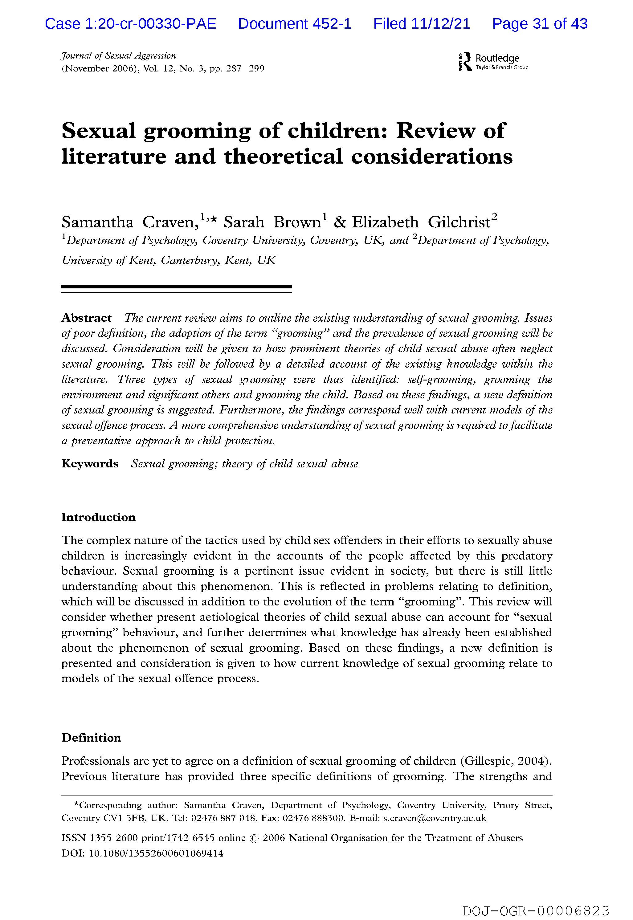 The image displays the first page of a research paper titled "Sexual Grooming of Children: Review of Psychological Literature and Theoretical Frameworks" by Emily Brown and Elizabeth McAllister.