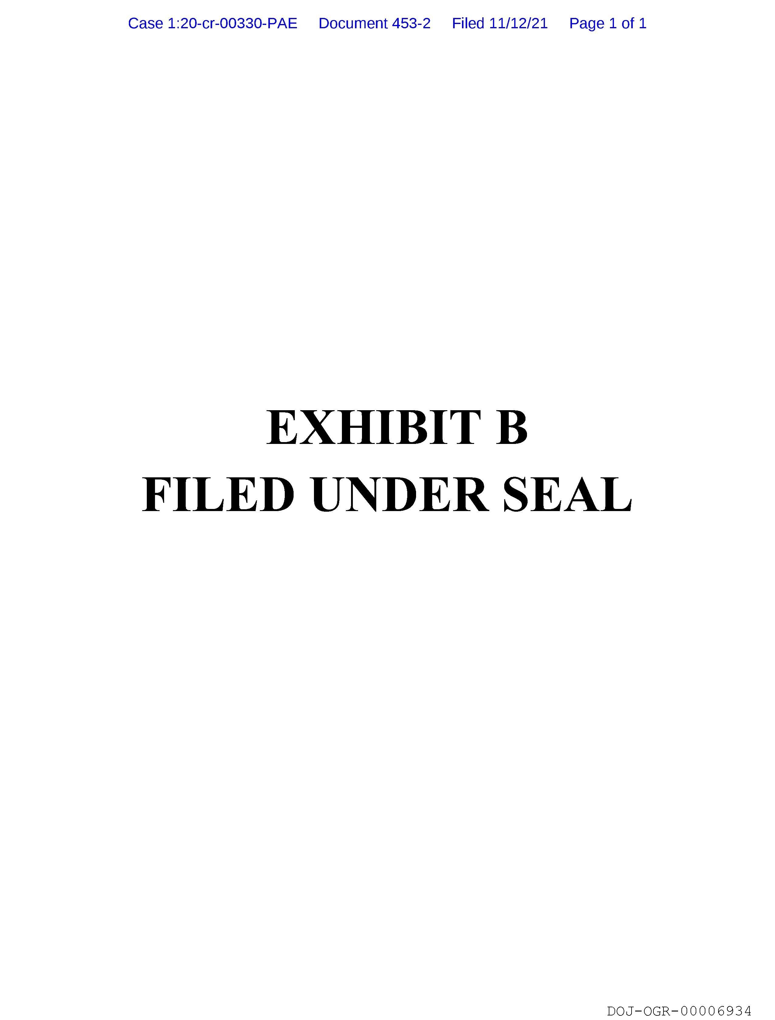 The image displays a document with the title "EXHIBIT B" at the top, suggesting that it is part of a larger legal or official proceeding. The text on the document indicates that it has been filed under seal, which means it is confidential and not meant for public viewing. The background of the image is a plain white surface, highlighting the importance of the content within the frame. The focus is solely on the document itself with no additional context provided.