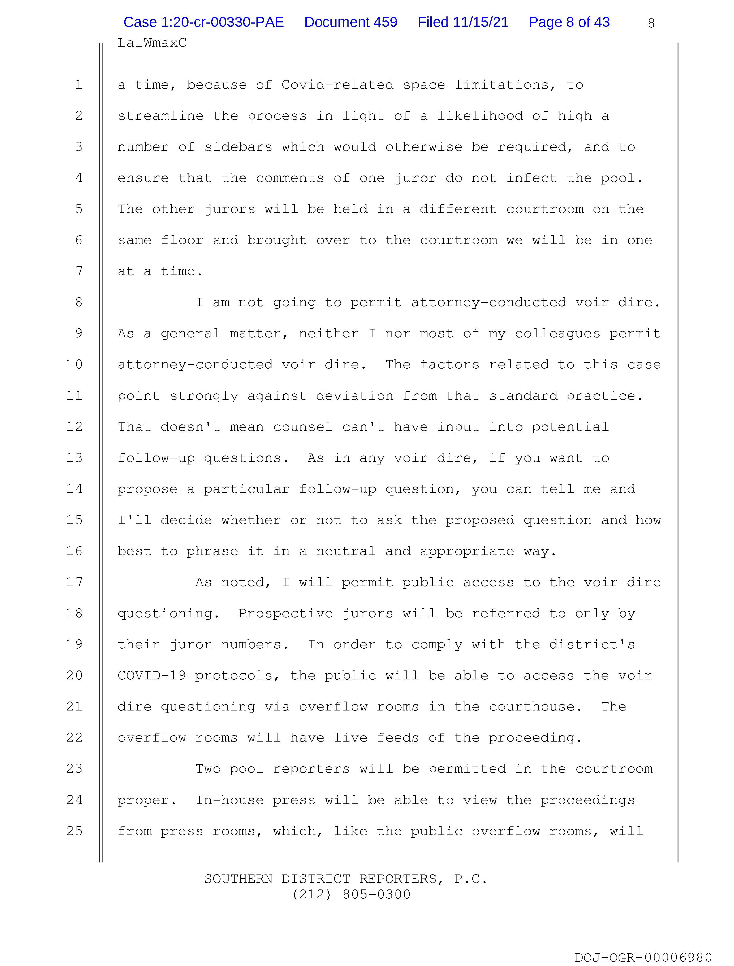 The image displays a scanned document with visible text and some blacked-out sections. The text appears to be from an official letter or report, possibly related to a legal case given the references to "Judge" and "Courtroom." There are also mentions of names that have been redacted. However, without more context, it's not possible to determine the exact nature of the document. The text is printed in black ink on a white background, indicating a standard typewritten format.